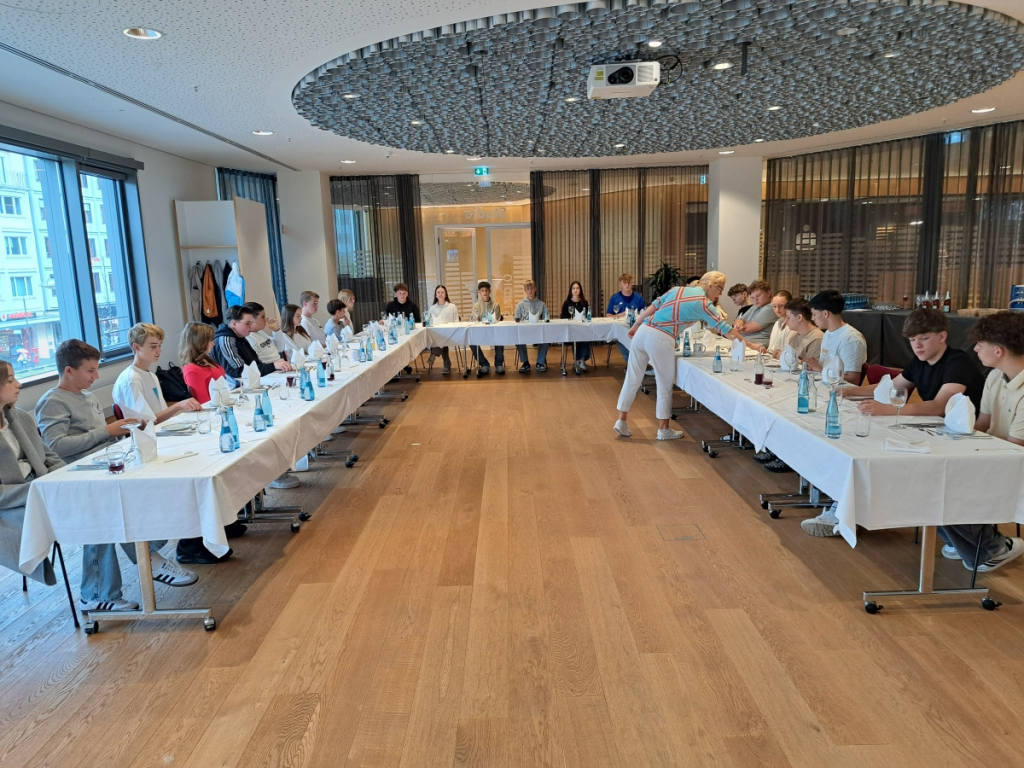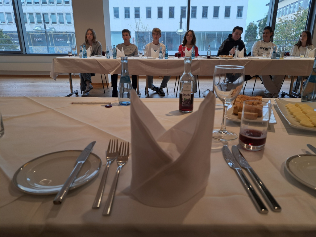 Das alles und noch viel mehr konnten unsere Vorabgangsklasse beim Knigge-Kurs im Sparkassenhaus Pforzheim erleben. Wer grüßt wen? Wer gibt wem die Hand? Welches Besteck benutzt man wann? Der unterhaltsame Workshop für gutes Benehmen begeisterte nicht nur wegen des leckeren Essens. Dank an den Förderverein für die erneut großzügige Unterstützung!