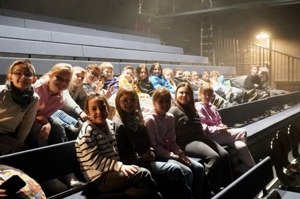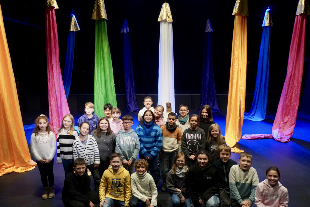 Wir waren zu Besuch im Theater in Karlsruhe. Dort trafen wir in einem dunklen Märchenwald ein Kind: Das hatte keinen Namen, es war eingesperrt und arm und es sollte Stroh zu Gold spinnen. Es ist weggelaufen und traf im Märchenwald auf ein anderes Kind, das auf den Namen Hänselkrötel hörte. Auch Hänselkrötel ist weggelaufen, weil er bei Fremden eingesperrt wurde, wo er immer nur ekligen Runkelrübenbrei zu essen bekam. Wir fanden: Das ist nicht okay und so darf kein Kind aufwachsen! Kinder sollen einen Namen haben, sollen in einer Familie leben, sollen genug zum Essen haben, sollen spielen und sich erholen, sollen zur Schule gehen und Freunde treffen. Dass Kinder diese und andere Rechte haben, zeigten wir den beiden Kindern am Ende unseres Besuchs. Dazu durften wir sogar selbst auf die Bühne und wurden zu Schauspielerinnen und Schauspielern. Das war richtig toll!