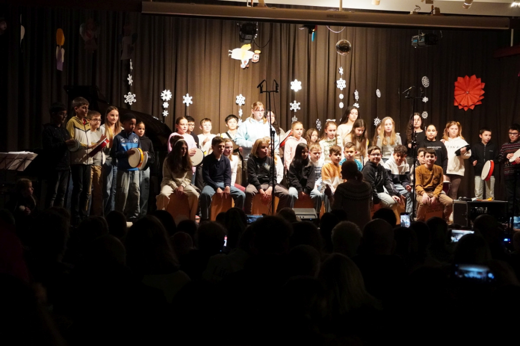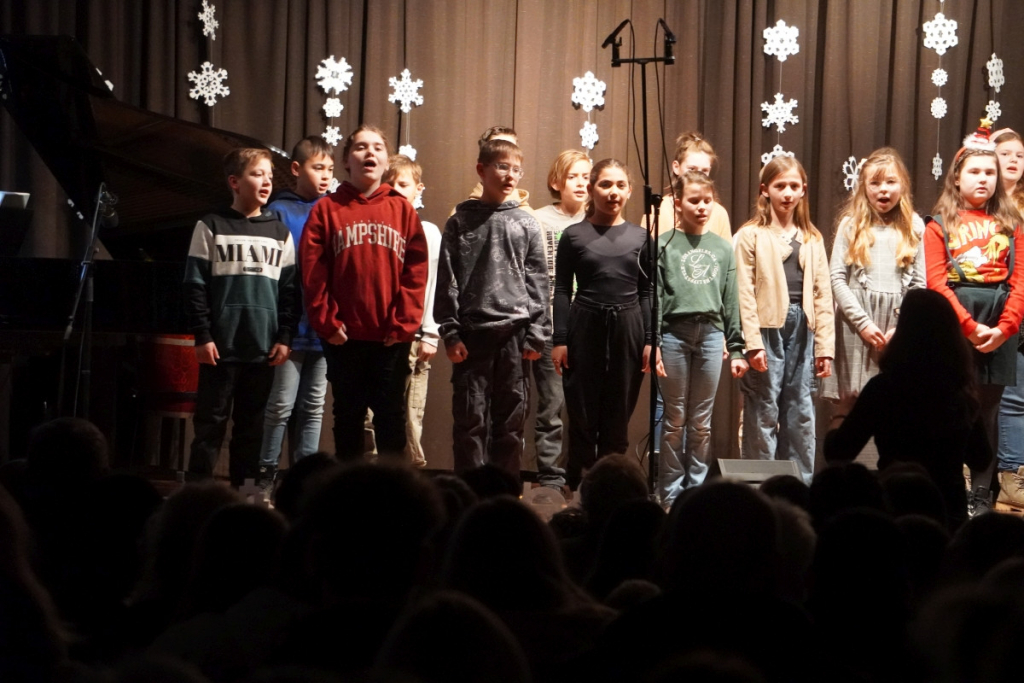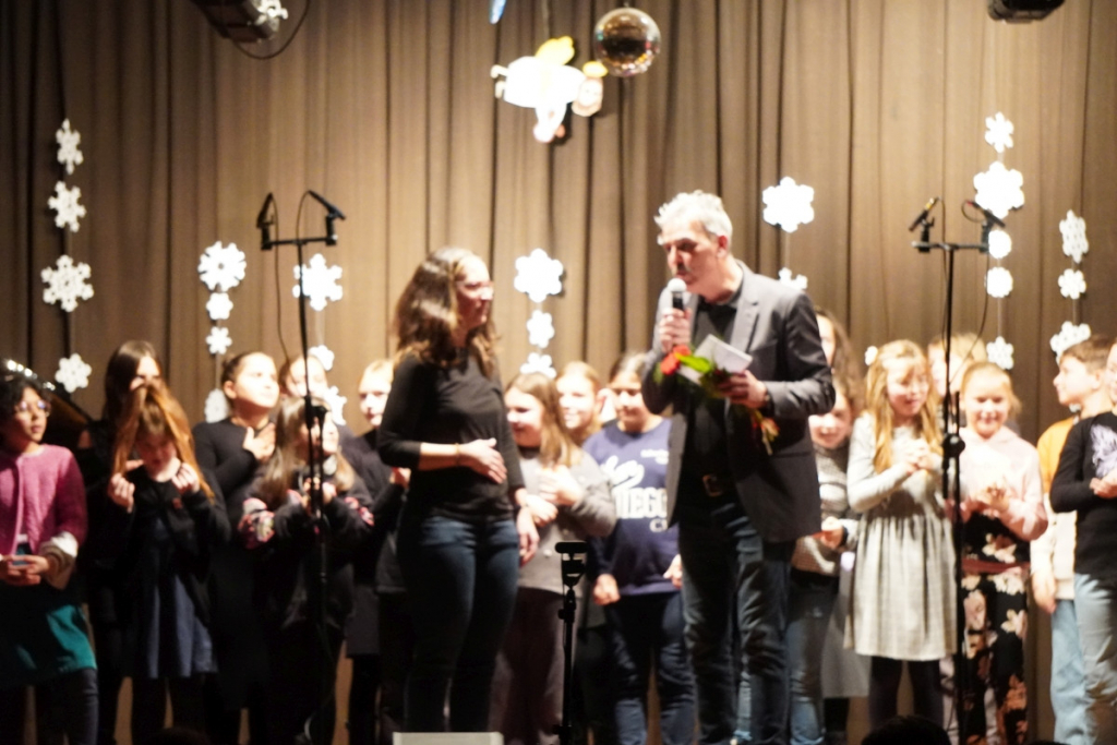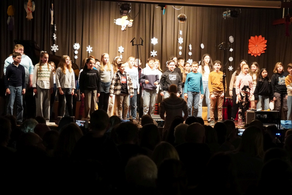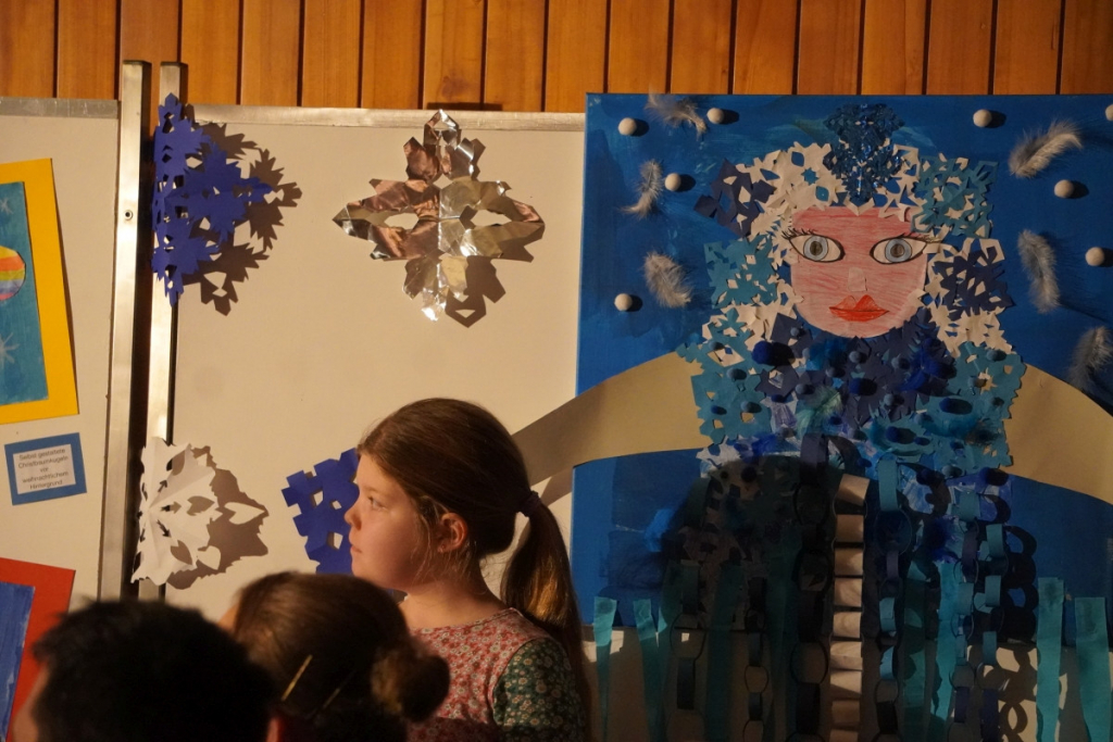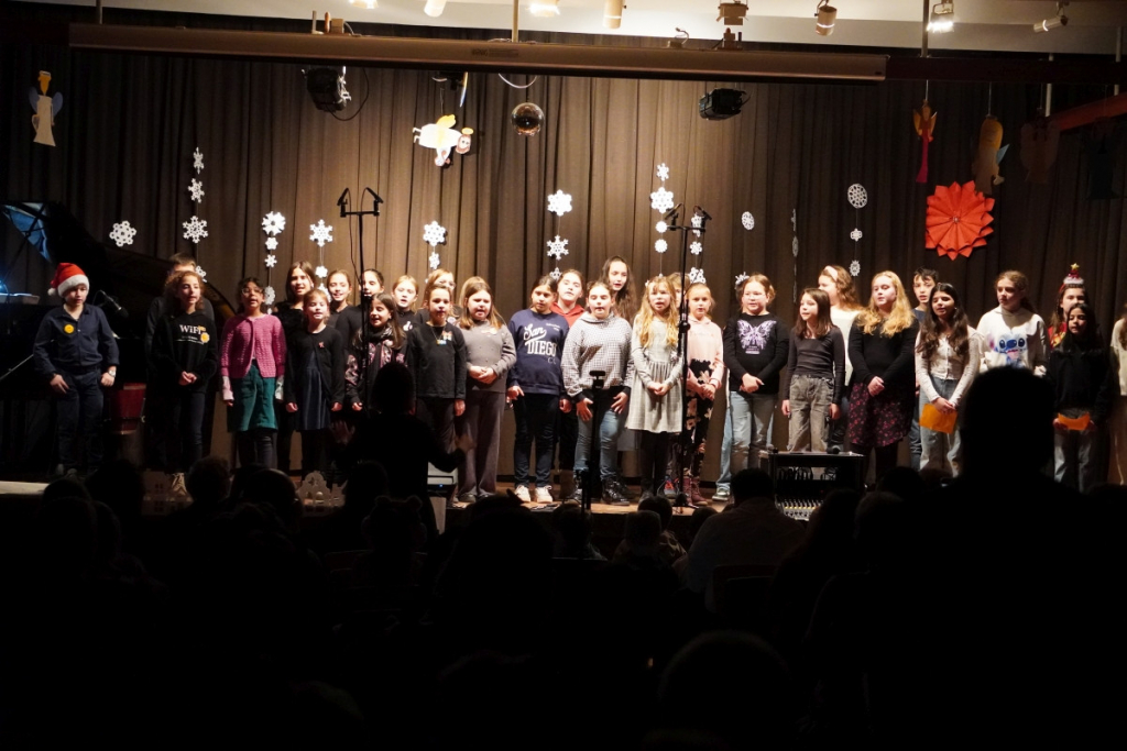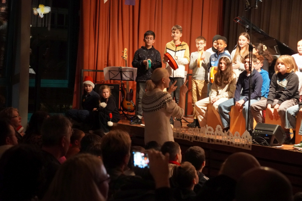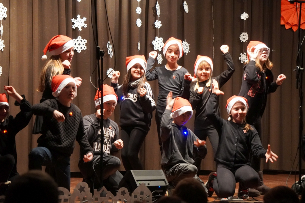 Selbstgemacht war an diesem wunderbaren Abend alles: Die musikalischen Beiträge Klassen 3 bis 5, die Tanzchoreografie der Klasse 3b, die Kunstwerke der Klassen 3a, 3b und 4a, die Weihnachtskantate der beiden Chöre wie auch die Moderation unserer beiden Profi-Ansager. Und siehe da: Die Begeisterung der Eltern war dann auch tatsächlich so groß, wie man sich das bei einer echten Bescherung vorstellt.