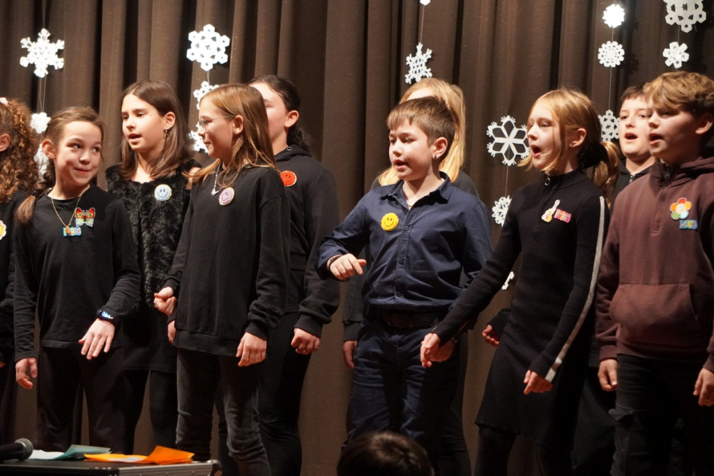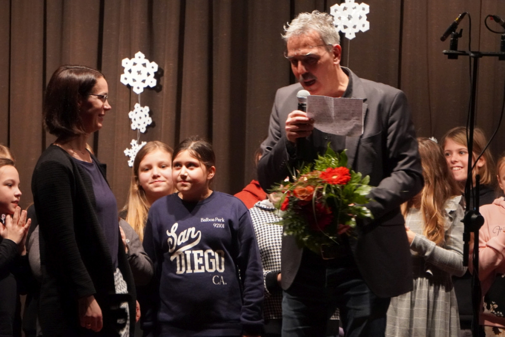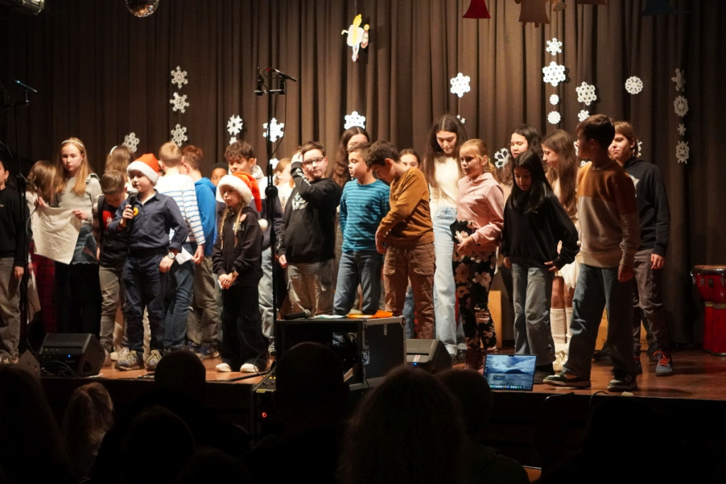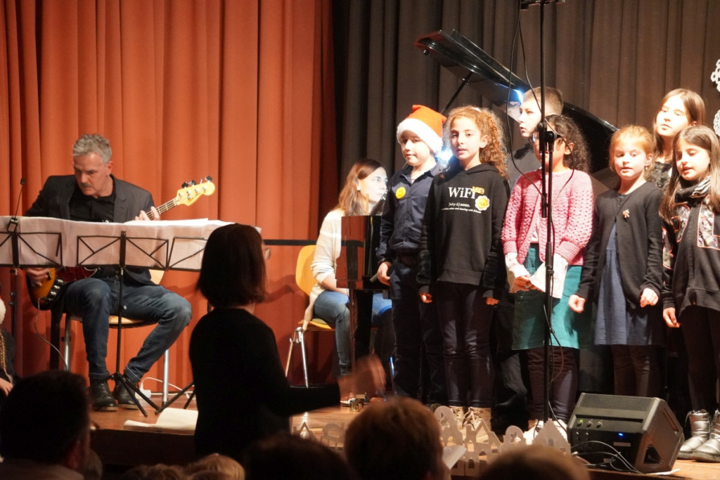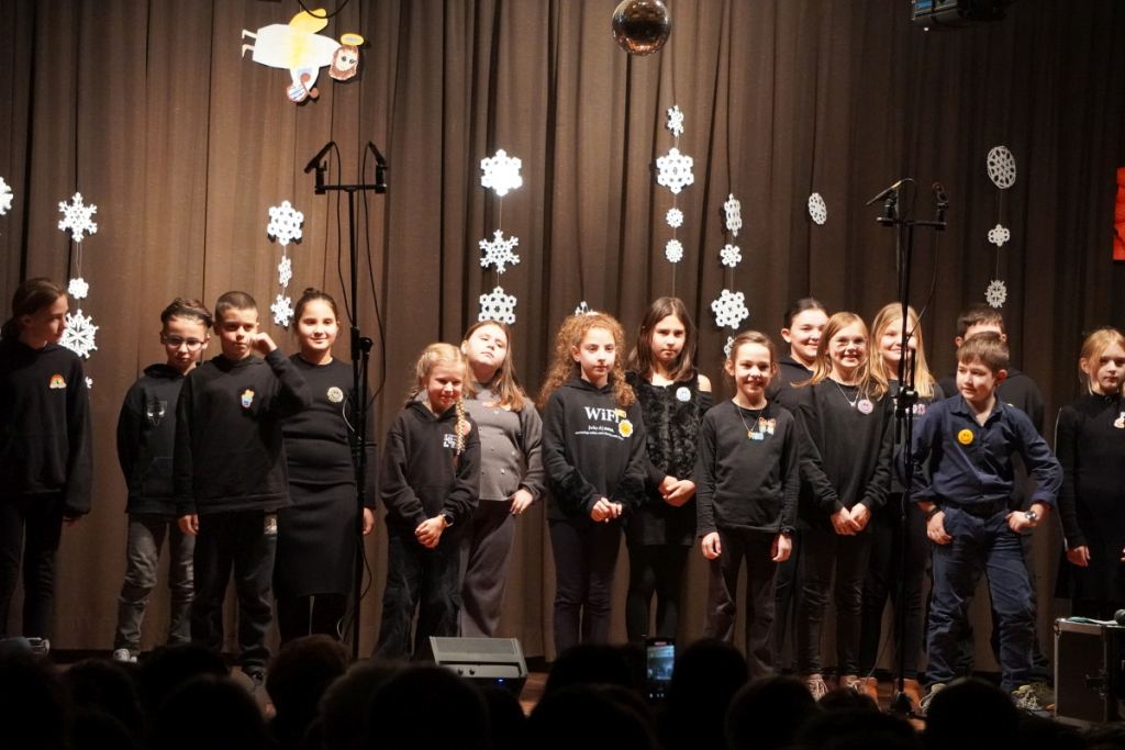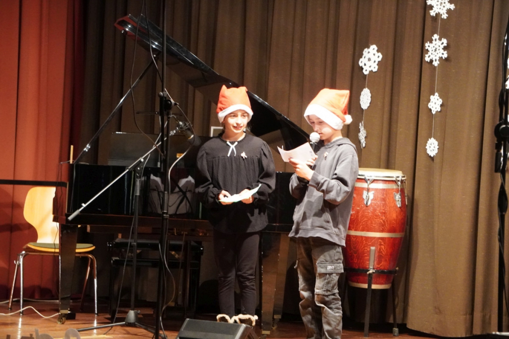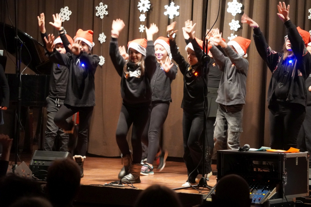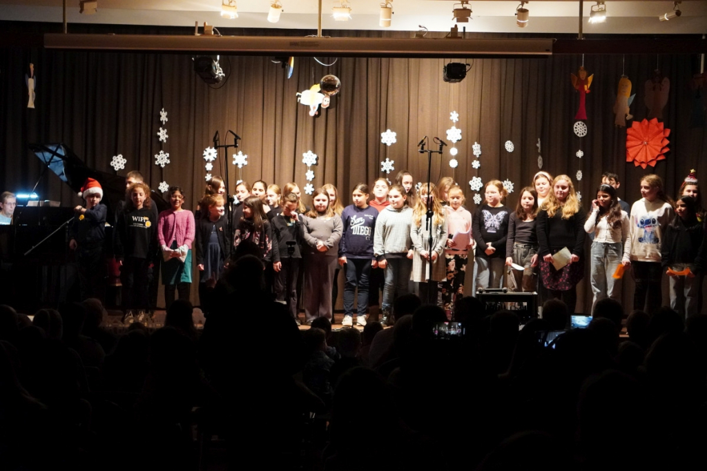 Selbstgemacht war an diesem wunderbaren Abend alles: Die musikalischen Beiträge Klassen 3 bis 5, die Tanzchoreografie der Klasse 3b, die Kunstwerke der Klassen 3a, 3b und 4a, die Weihnachtskantate der beiden Chöre wie auch die Moderation unserer beiden Profi-Ansager. Und siehe da: Die Begeisterung der Eltern war dann auch tatsächlich so groß, wie man sich das bei einer echten Bescherung vorstellt.