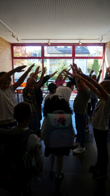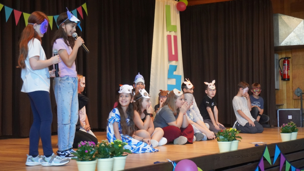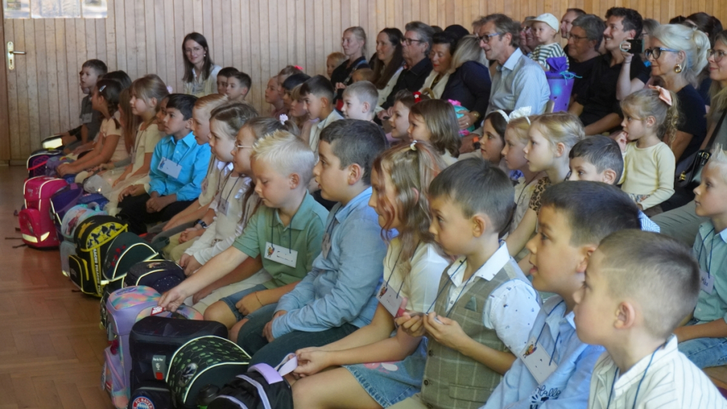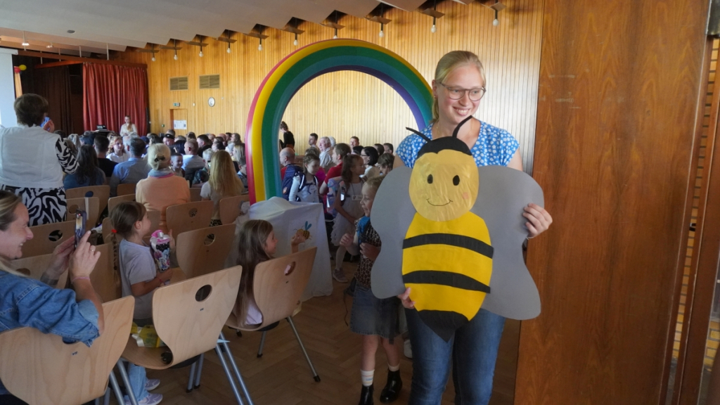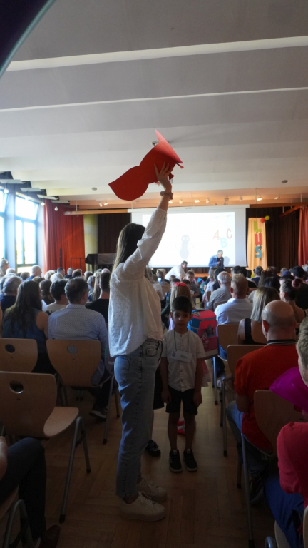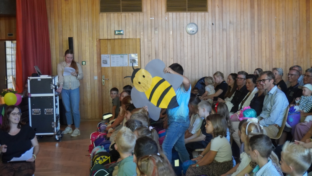 Die Feier begann in der vollbesetzten Aula mit einem bunten Programm: Die Viertklässler begrüßten die neuen Mitschülerinnen und Mitschüler mit Musik und Liedern, es gab kleine Beiträge und herzliche Worte des Schulleiters. Ein Höhepunkt war die Vorstellung der beiden Klassentiere – Ameise und Biene – die für Fleiß, Gemeinschaft und Stärke stehen und die Kinder durch die nächsten Schuljahre begleiten werden.