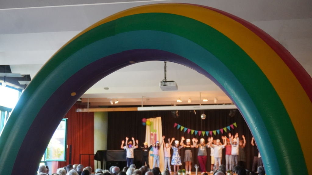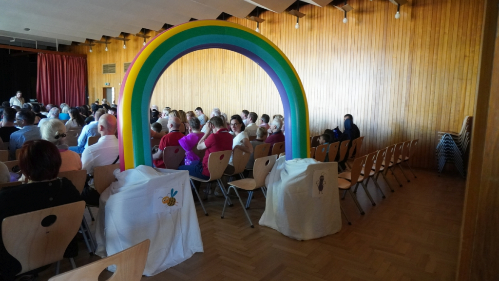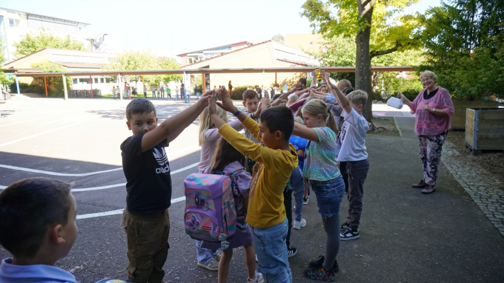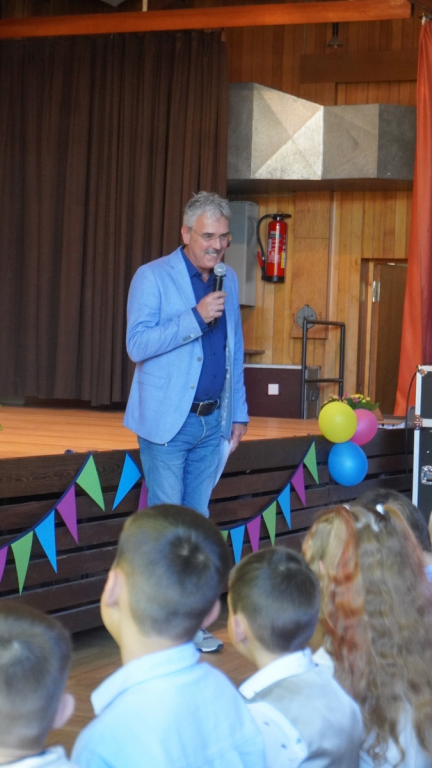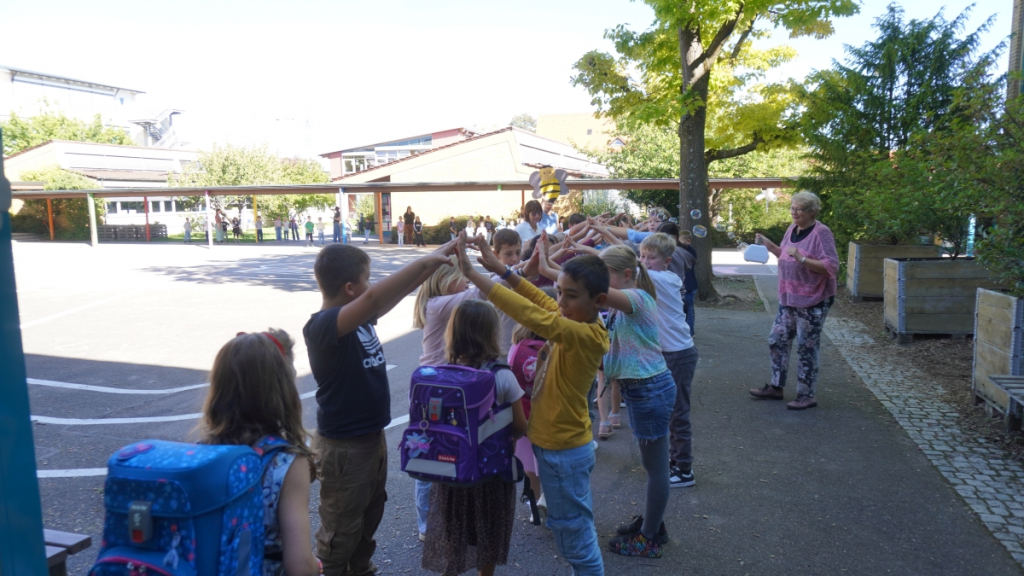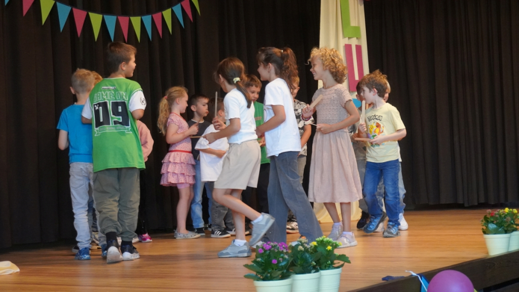Die Feier begann in der vollbesetzten Aula mit einem bunten Programm: Die Viertklässler begrüßten die neuen Mitschülerinnen und Mitschüler mit Musik und Liedern, es gab kleine Beiträge und herzliche Worte des Schulleiters. Ein Höhepunkt war die Vorstellung der beiden Klassentiere – Ameise und Biene – die für Fleiß, Gemeinschaft und Stärke stehen und die Kinder durch die nächsten Schuljahre begleiten werden.