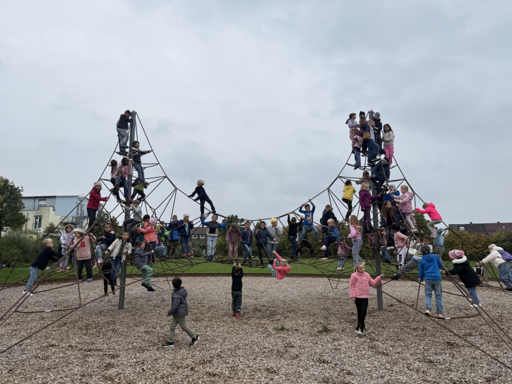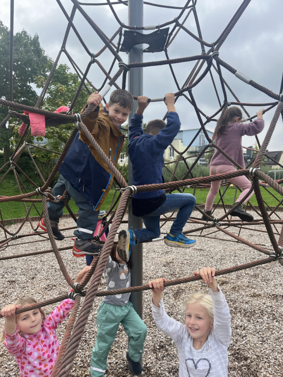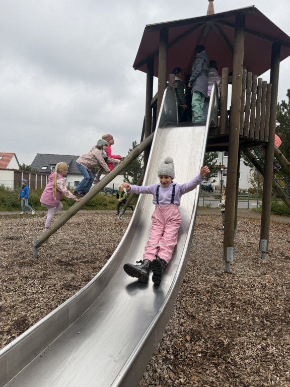 Das Ziel unseres Ausflugs war der Sonnenspielplatz. Dort herrschte sofort buntes Treiben: Einige Jungen stürmten den Fußballplatz, andere Kinder eroberten die Klettergeräte, flitzten die Rutschen hinunter oder übten gemeinsam eine kleine Zirkusaufführung ein.