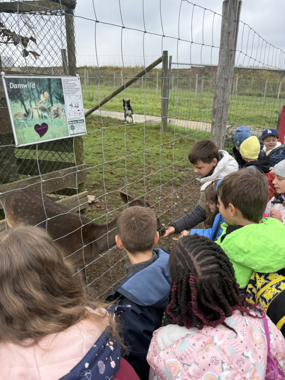 Nach der ersten Etappe legten wir eine ausgiebige Frühstückspause auf einem kleinen Spielplatz ein. Während die Brotdosen ausgepackt wurden, konnten die Kinder klettern, schaukeln und spielen. Gestärkt und fröhlich ging es weiter – vorbei an einem kleinen Wildparkgehege, in dem Rehe neugierig unsere Wandergruppe beäugten.