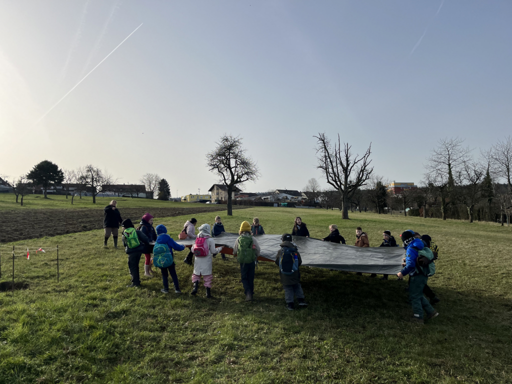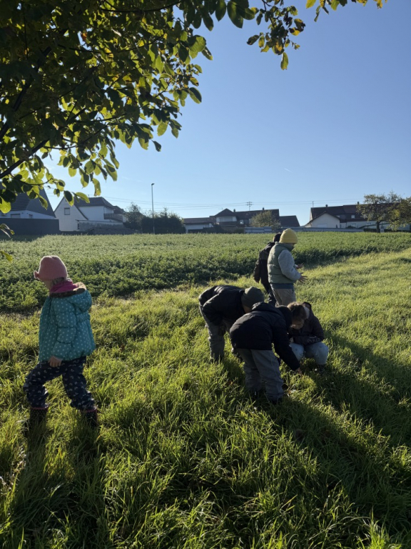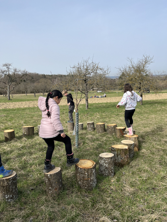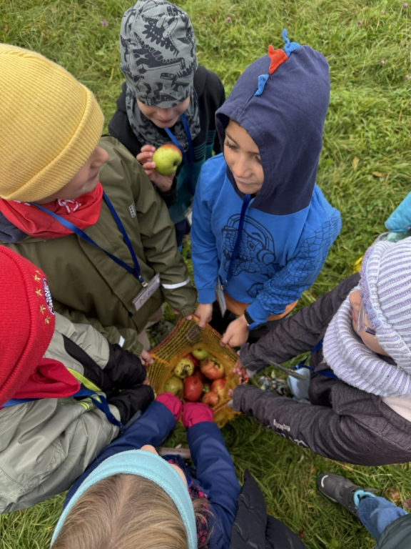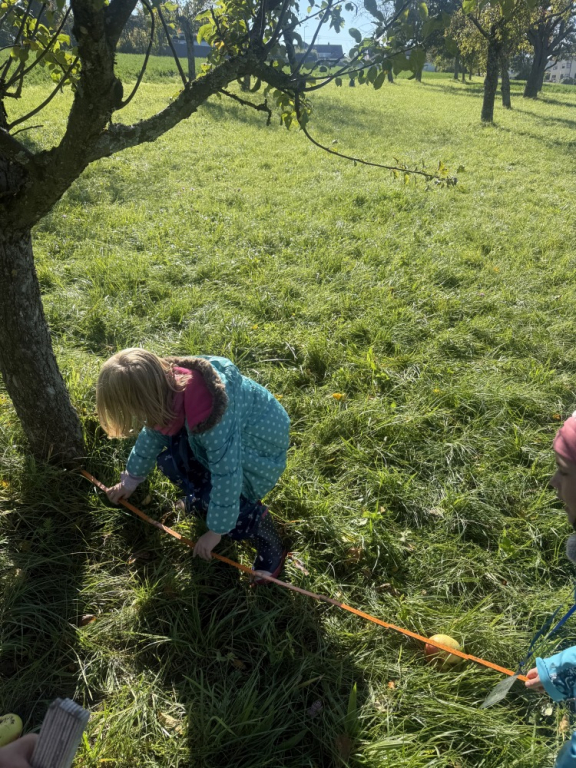 Ein besonderes Highlight war das „Fühlen mit verbundenen Augen“: In Partnerarbeit ertasteten die Kinder die Rinde der Bäume und entdeckten dabei, wie unterschiedlich sich Natur anfühlen kann. Natürlich durfte auch eine gemütliche Vesperpause unter freiem Himmel nicht fehlen – frische Luft macht schließlich hungrig! Ein riesiges Dankeschön geht an den Förderverein, der dieses tolle Projekt möglich macht, und an Frau Raus für die wunderbare Begleitung. Die Begeisterung der Kinder ist groß – und alle freuen sich schon sehr auf die nächsten Abenteuer auf der Streuobstwiese! 🌿✨