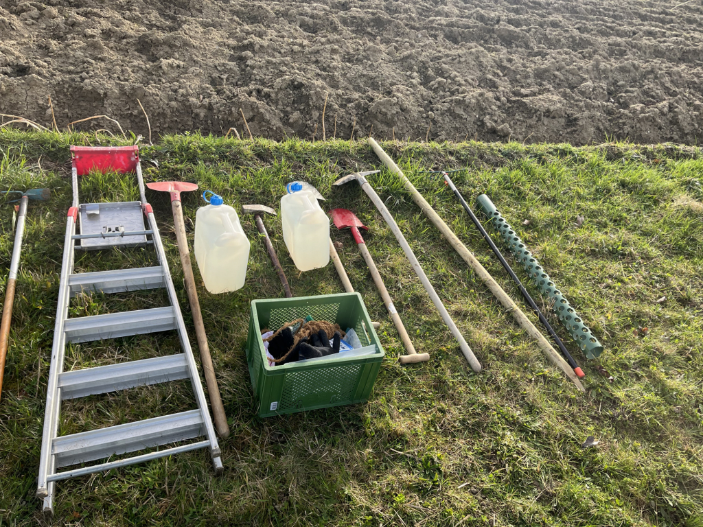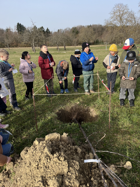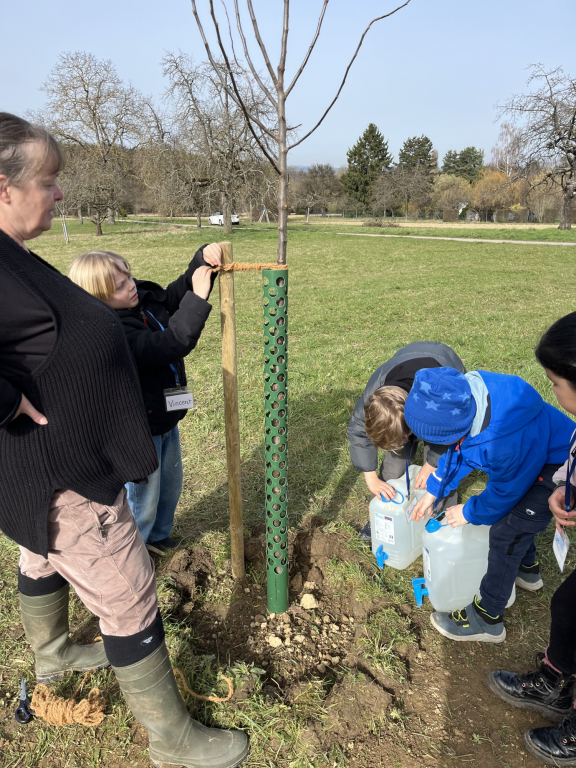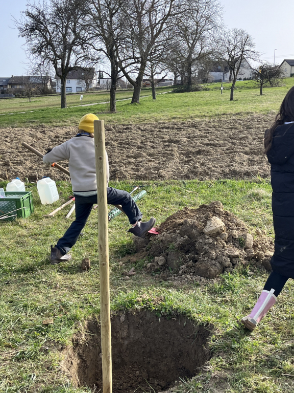Diese Woche Anfang März war es endlich wieder so weit: Die Zweitklässler durften auf die Streuobstwiese! Und diesmal stand etwas ganz Besonderes auf dem Plan: „Wir pflanzen einen Baum!“ Die Klasse 2a hat einen Apfelbaum gepflanzt und die Klasse 2b einen Birnenbaum. Bevor wir loslegten, haben wir erst einmal über den Aufbau eines Baumes gesprochen und dabei viel gelernt. Dann ging es an die Arbeit: Zuerst wurde ein Pfahl in das Loch gehämmert, damit der junge Baum später eine gute Stütze hat. Danach schnitten wir vorsichtig die Wurzeln an und setzten den Baum in das Loch. Mit vereinten Kräften wurde alles wieder mit Erde aufgefüllt – da hieß es: „Alle anpacken!“ Zum Schluss befestigten wir den Baum am Pfahl und gossen ihn gut mit Wasser. Jetzt hoffen wir natürlich, dass unsere beiden Bäume kräftig wachsen und uns irgendwann leckere Früchte schenken. Wer unsere Apfel- und Birnenbäume sehen möchte, kann sie gerne auf der Streuobstwiese besuchen. Vielleicht entdeckt ihr ja schon bald die ersten Knospen!