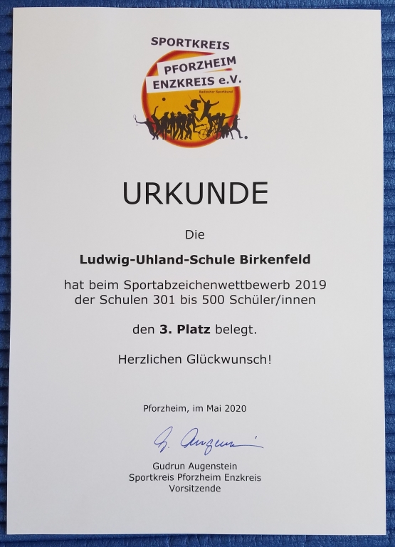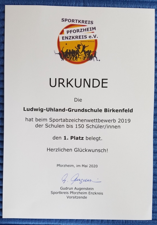 Unsere Grundschüler haben im Sportjahr 2019 die meisten Sportabzeichen bei den Schulen bis 150 Schüler im Sportkreis Pforzheim absolviert und erhielten von der Sportkreisvorsitzenden Gudrun Augenstein eine Urkunde und einen Gutschein über 150,00 €.