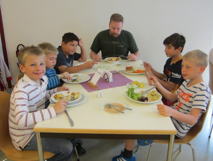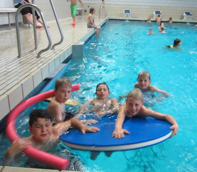 Gegen 18.00 Uhr wurde dann das Abendbuffet (Pizza und Salat) gestürmt und anschließend gab es bei dem tollen Wetter kein Halten mehr. Auf dem Kunstrasenplatz lieferte man sich mit den Schülern aus Warmbronn ein tolles Fußballmatch. Die letzte Stunde vor dem Schlafengehen war nochmals ein Highlight des Tages. Das sportschuleigene Schwimmbad war nur für die acht Tischtennismannschaften geöffnet und so konnte man rund 30 Jungen und Mädchen springen, tauchen, schwimmen und toben sehen. Nach diesem erlebnisreichen Tag war es in den Zimmer dann relativ schnell ruhig.
