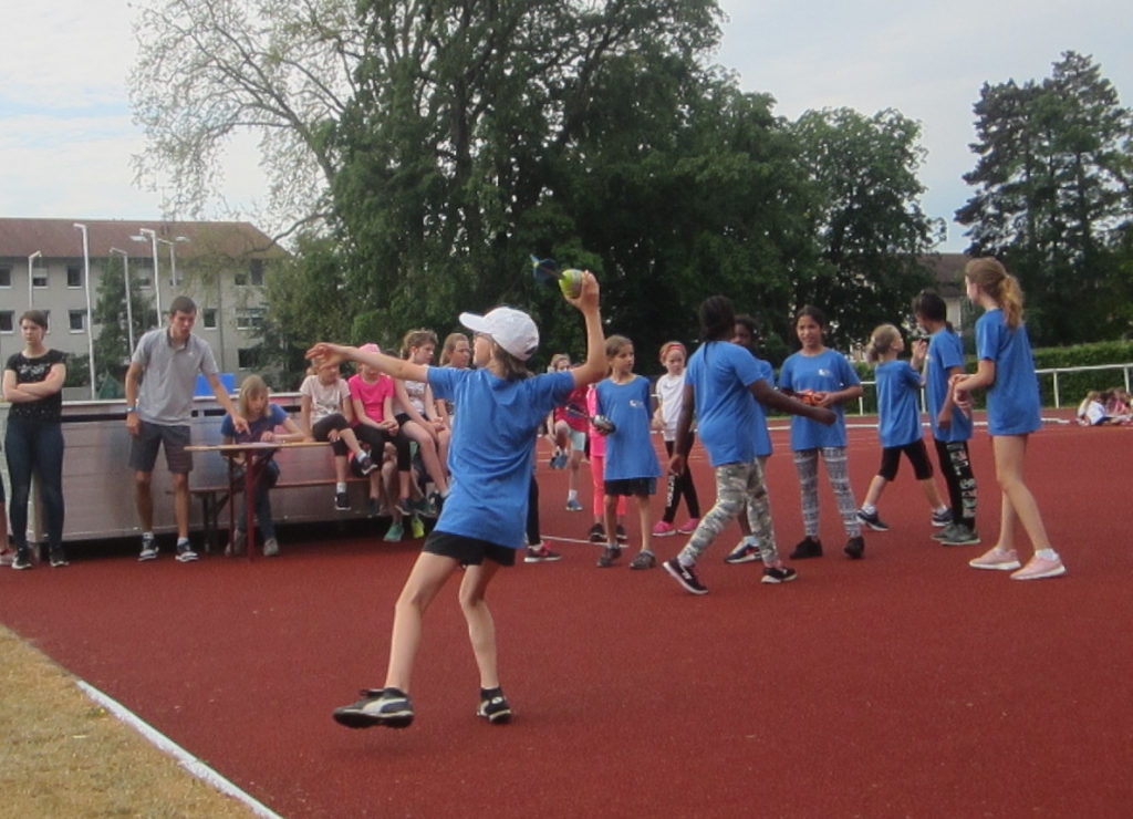 Wir stellten eine Mädchen- und eine Jungenmannschaft. Eine Mannschaft bestand aus jeweils zehn Schülerinnen und Schüler und jeder musste einen Dreikampf, bestehend aus den Disziplinen 40m Hürdensprint, Zonenweitsprung und Heulballwurf, absolvieren.