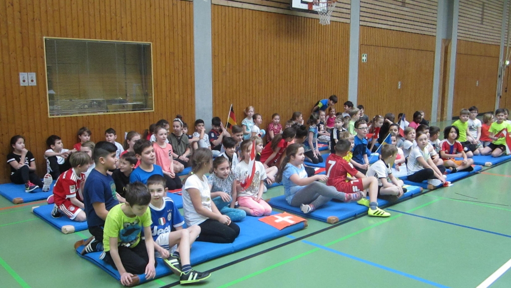 Zu Beginn zogen die Länder mit ihren Flaggen feierlich in die Sporthalle ein. Danach wurden wir von Frau Koch und Frau Hildebrand begrüßt.