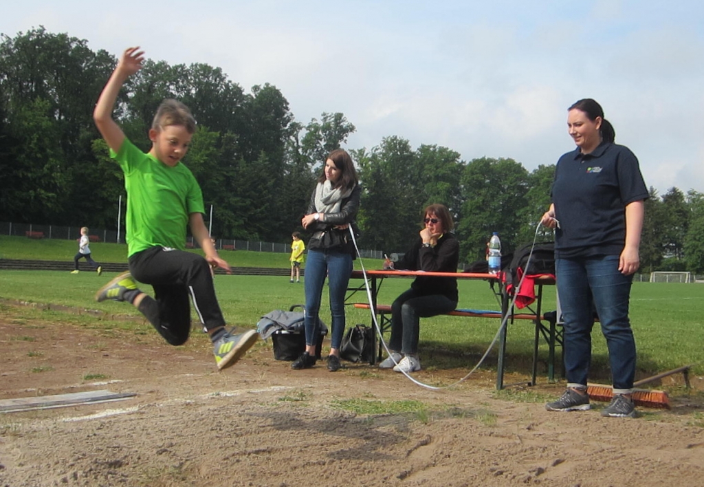 Bei optimalem Wetter - nicht zu heiß und nicht zu kalt- liefen die Kinder hervorragende Zeiten über die 800- bzw. 1000m-Strecke. Danach ging es an die anderen Stationen. Jede Riege absolvierte in unterschiedlicher Reihenfolge den Sprint, den Weitsprung und das Ballwerfen. Überall wurde konzentriert gearbeitet, sodass auch hier tolle Weiten und Zeiten herauskamen.