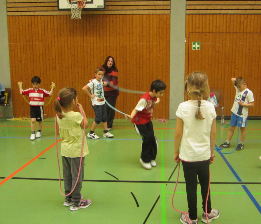 An der 1. Station musste man Seilspringen. Die 6-9jährigen mussten Laufschritte machen. Die 10-11jährigen mussten Grundsprünge vorwärts machen.
