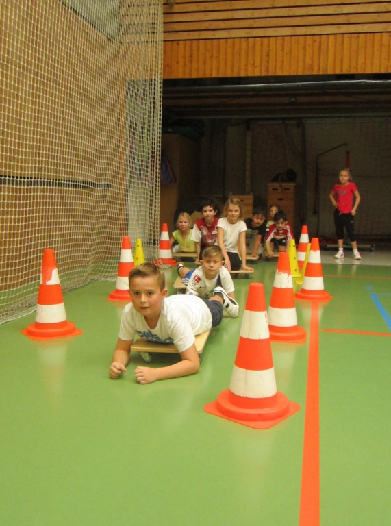 An der 2. Station musste man Rollbrett fahren. Man musste bäuchlings auf dem Rollbrett liegen und durch einen Slalomparcours fahren. Dabei wurde die Zeit gestoppt.