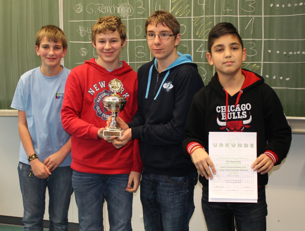 Aufgrund der geringen Teilnehmerzahl in einigen wenigen Wettkampfgruppen wurden Mannschaften zu einer einzigen heterogenen Gruppe zusammengefügt, um eine ausreichende Rundenzahl hinzubekommen. Die unterschiedlichen Mannschaften traten zwar gegeneinander an, jedoch erfolgte die Klassifizierung entsprechend ihrer Wettkampfgruppe. Betroffen hiervon waren die u.a. Realschulmannschaften. Für unsere Realschüler bedeutete dies zusätzlich gegen starke Mannschaften aus den Gymnasien anzutreten. Trotz dieser erschwerten Bedingungen konnte sich die Mannschaft der Ludwig-Uhland-Schule durchsetzen und den ersten Platz in der Wettkampfgruppe der Realschulen erkämpfen. Neben einer Urkunde und einem Siegerpokal winkte auch die Qualifikation zur nächsten Runde, der Nordbadischen Schulschachmeisterschaft, welche bereits am 26.02.2015 in Karlsruhe stattfinden wird. Glückwunsch an Tobias Di Floriano, Eren Arkadas, Luca Ulmer und Tim Oelschläger!