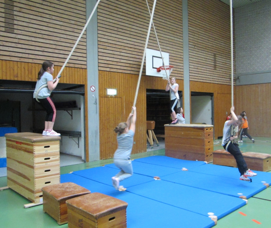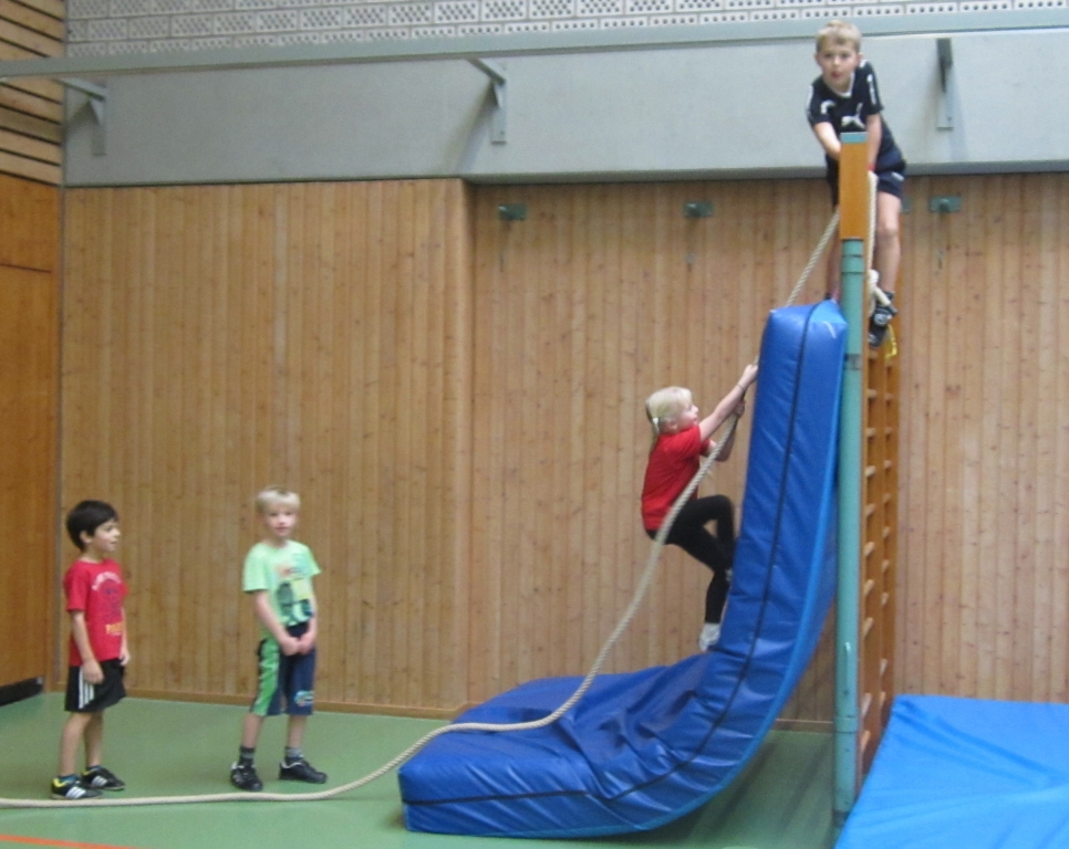 Stark frequentiert beim diesjährigen Großgeräte-Sporttag war wieder der Blaue Elefant, ein mit einer Weichbodenmatte verkleidetes Pferd zum Überspringen bzw. Überrollen. Aber auch die Taue zum Klettern und Schwingen, die Ringe, das Trapez, die vielen Barren zum Überklettern und Hangeln, die Recks zum Turnen bzw. Skispringen, der Berg an der Sprossenwand, der nur mit einem dicken Tau erklettern werden konnte und die Balancierlandschaft wurden von allen Kindern ausprobiert und für gut befunden.