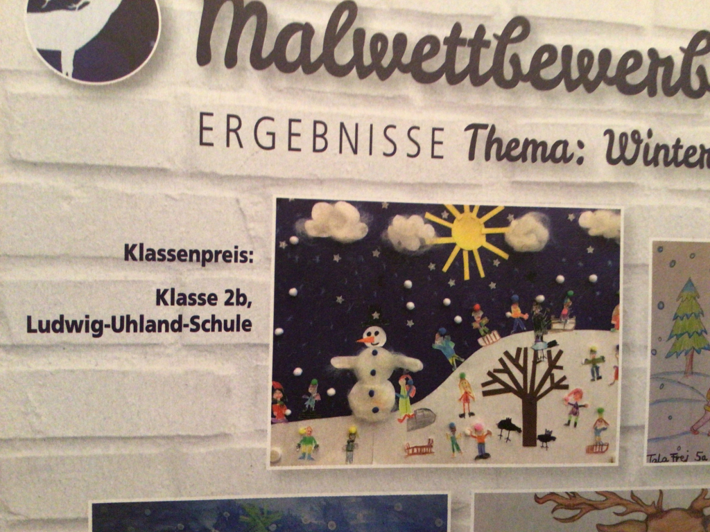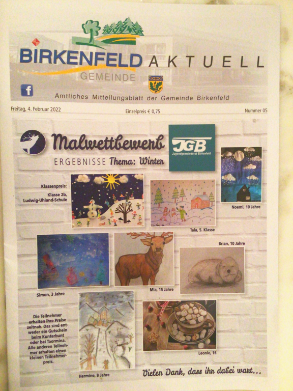 Beim Malwettbewerb mit dem Thema „Winter“, der vom Jugendgemeinderat Birkenfeld ausgeschrieben war, gewann die Kl. 2b der Ludwg-Uhland-Schule den Klassenpreis. Auch diese Aktion war dem Mitteilungsblatt der Gemeinde Birkenfeld ein Platz auf der Titelseite wert. Damit haben es die jungen Künstler zum zweiten Mal geschafft, auf einer Titelseite zu erscheinen.