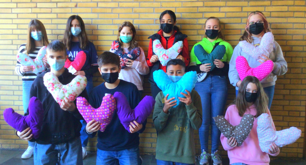 Im Unterricht entstanden farbenfrohe Herzkissen, die an die Brustkrebsstation des Heliosklinikums gespendet wurden. Die Idee hierzu kam von einer Schülerin, die selbst in der Familie erlebt hatte, was die Diagnose Brustkrebs bedeutet und aktiv etwas tun wollte, um Frauen mit Brustkrebs zu unterstützen. Mit Begeisterung haben die Mitschülerinnen und Mitschüler die Projektidee aufgenommen und sich an die Nähmaschinen gesetzt. Es entstanden, mit viel Liebe und Sorgfalt genähte, herzförmige Kissen die von jedem Schüler und jeder Schülerin noch mit einem persönlichen Gruß versehen wurden. Die Herzkissen dienen an Brustkrebs erkrankten Frauen zum einen als Stütze nach der Operation, zum anderen sollen sie Mut spenden.