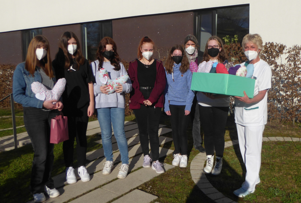 Am Mittwoch den 09.02.2022 war es dann soweit und sechs Schülerinnen konnten gemeinsam mit der Fachlehrerin Frau Volle, die Herzkissen vor dem Heliosklinikum an die Breast Care Nurse Christina Stojek übergeben. Sie nahm die Kissen freudestrahlend in Empfang, bedankte sich von Herzen bei den Schülerinnen für Ihr Engagement und freut sich schon die bunten Kissen an ihre Patientinnen weiterzugeben, für diese wären die Kissen in den Wochen nach der Operation ein hilfreicher Begleiter. Das Strahlen war auch, trotz Maske, in den Gesichtern der Schülerinnen zu sehen als sie, als Dankeschön für ihren Einsatz eine süße Überraschung überreicht bekamen. Herzlichen Dank dafür.