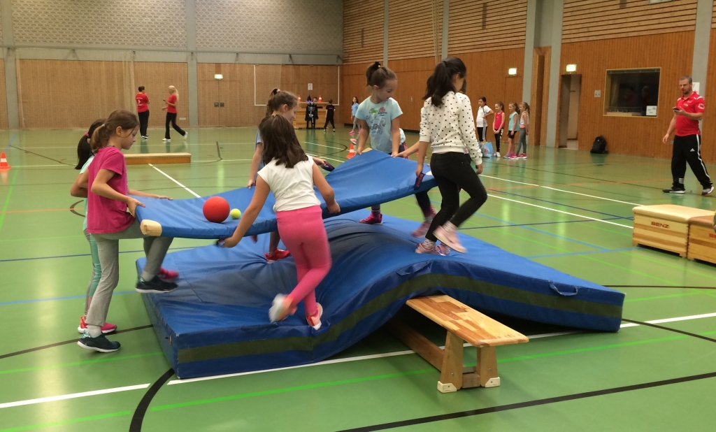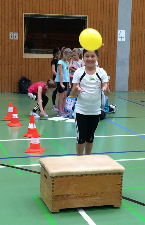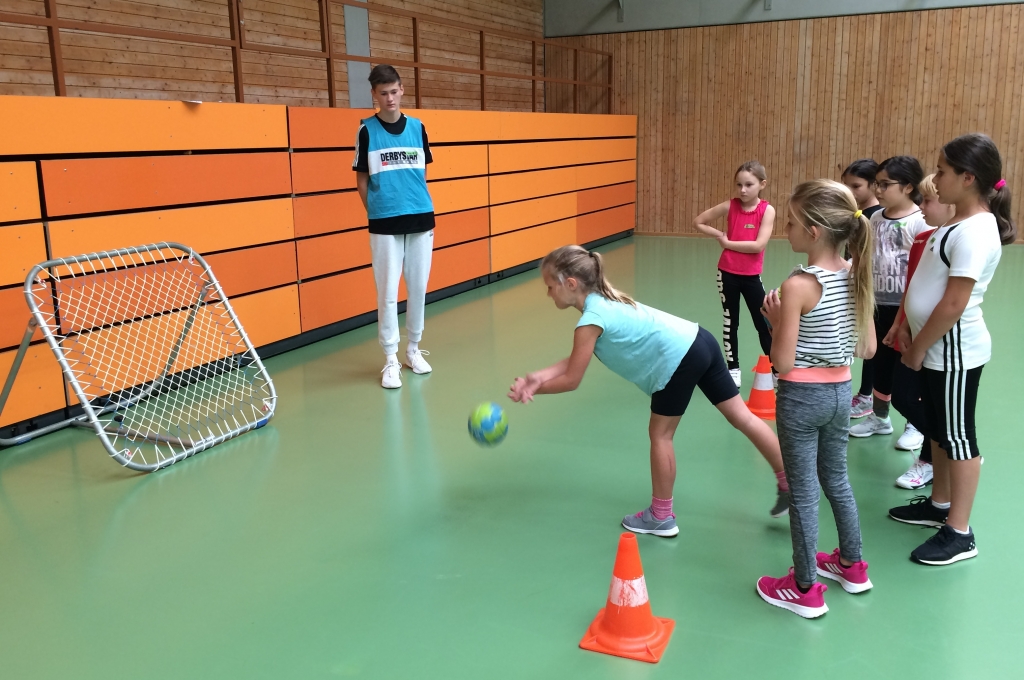 Bei der „Halloween-Jagd“, beim „Zielwerfen mit Abpraller“ und „Genaue Punktlandung“ wurde Werfen und Fangen geübt und bewertet, beim „Prellen über die Bank“ und beim „Luftballon-Jonglieren“ war Ballgefühl gefragt. Gut zusammenarbeiten musste die gesamte Gruppe beim „Balltransport“. Hier wurden mehrere Handbälle auf einer Matte durch einen Parcours transportiert.