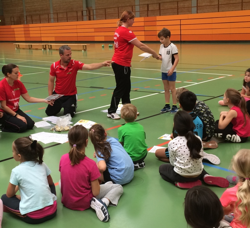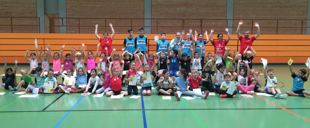 Pünktlich um 10.00 Uhr waren alle Stationen absolviert und die Siegerehrung begann. Jedes Kind erhielt eine Urkunde, ein AOK-Spiele-Abzeichen-Sticker und ein Heftchen mit kindgerechten Handballregeln.