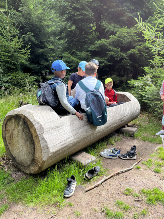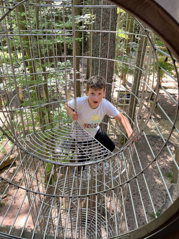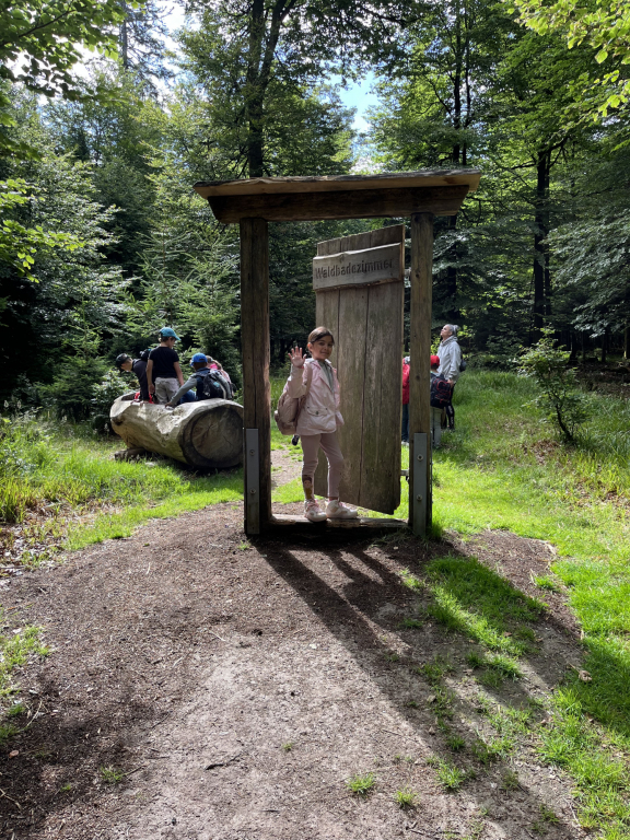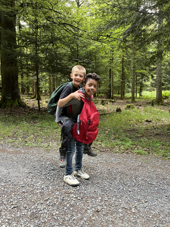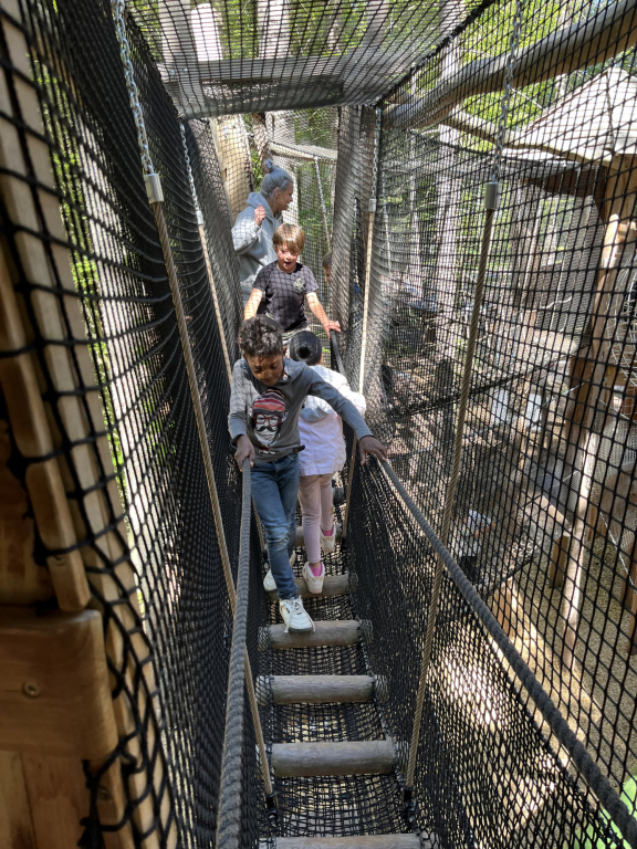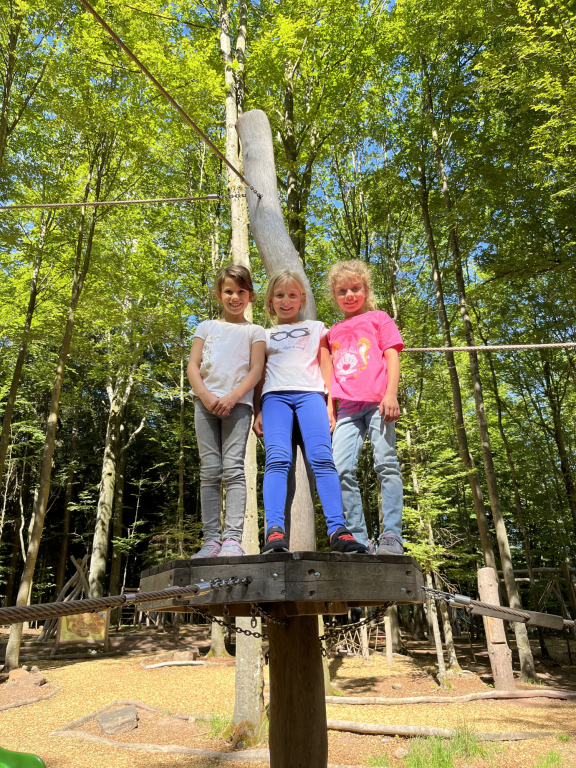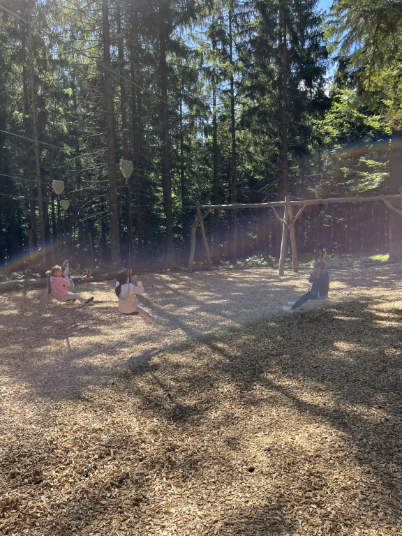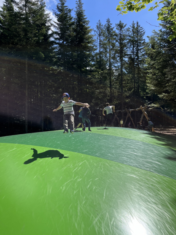 Oben angekommen sind ein paar auf’s Klo gegangen. Danach sind wir langsam losgelaufen. Wir sind erst ein bisschen durch den Wald und anschließend zum Abenteuerwald gelaufen. Im Abenteuerwald angekommen bin ich gleich auf das große Hüpfkissen gegangen. Es gab auch andere Stationen, zum Beispiel eine große Burg, ein Iglu, eine Seilrutsche, einen Niedrigseilparkour und andere coole Sachen.