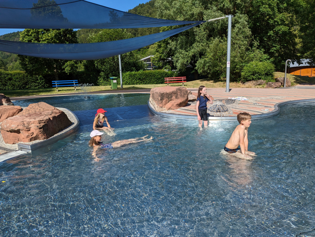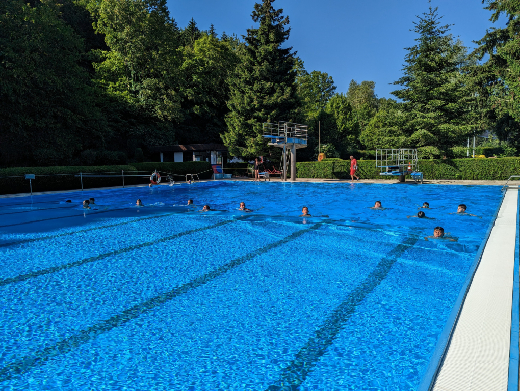 Im total leeren Schwimmbad - wir durften schon um 8.00 Uhr rein und die offizielle Badezeit beginnt erst um 10.00 Uhr - konnten die drei Lehrkräfte alle Kinder der Klasse gleichzeitig beschäftigen.
