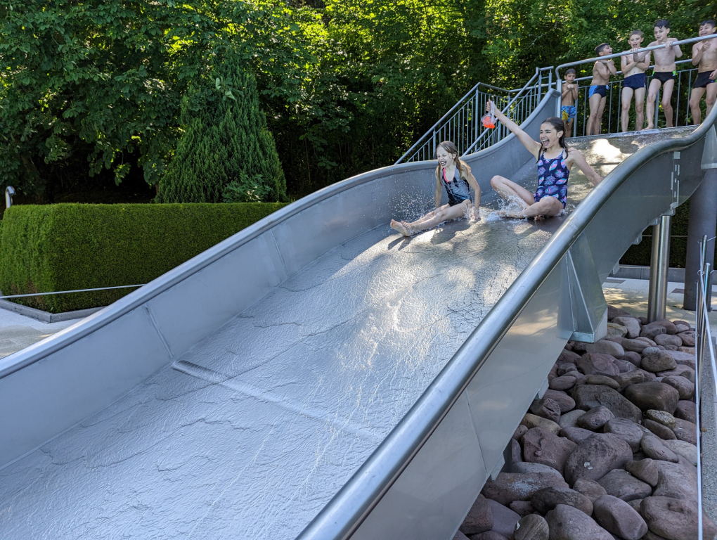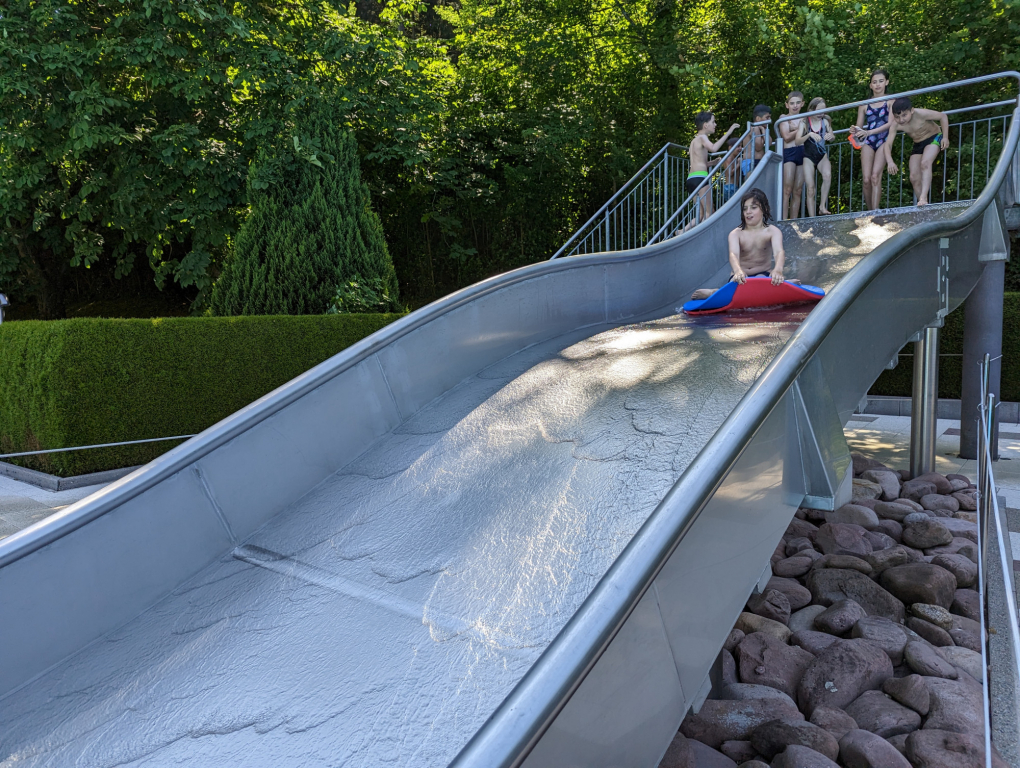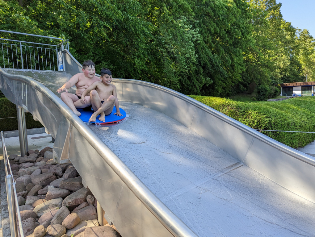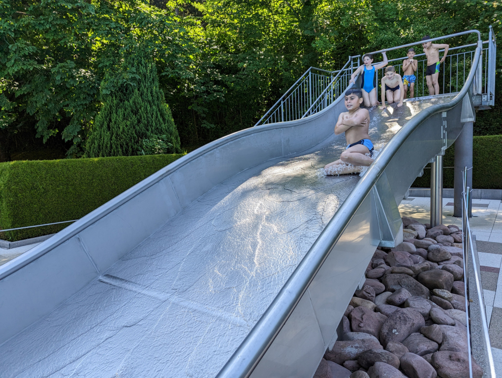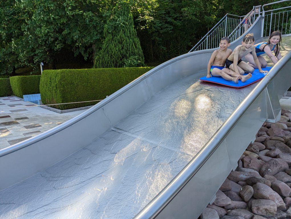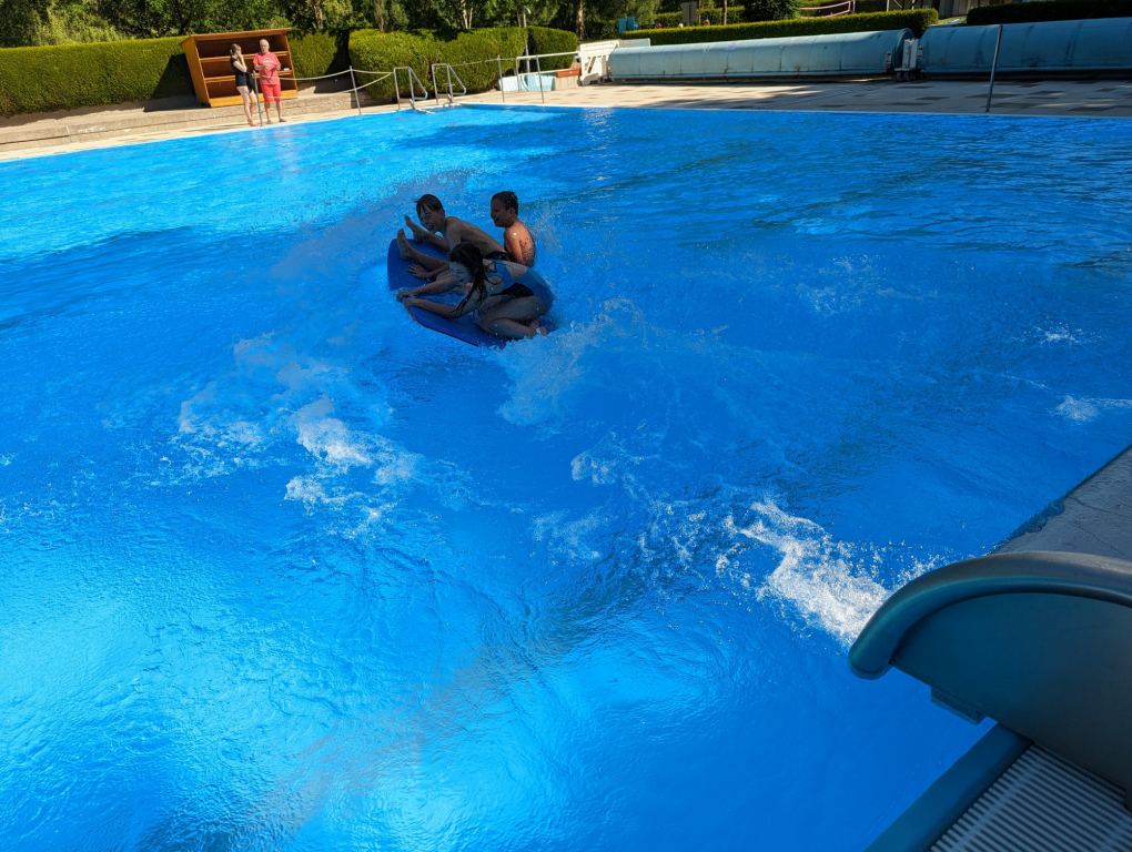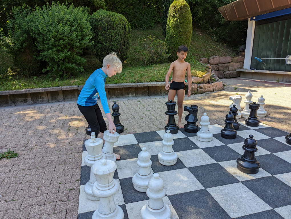 Erst danach durften die Kinder im Wasser oder auf der Wiese machen was sie wollten. Einige spielten Volleyball, andere Schach, wieder andere stürmten die Rutsche bzw. die Sprungbretter und ein paar machten einfach nur Pause.