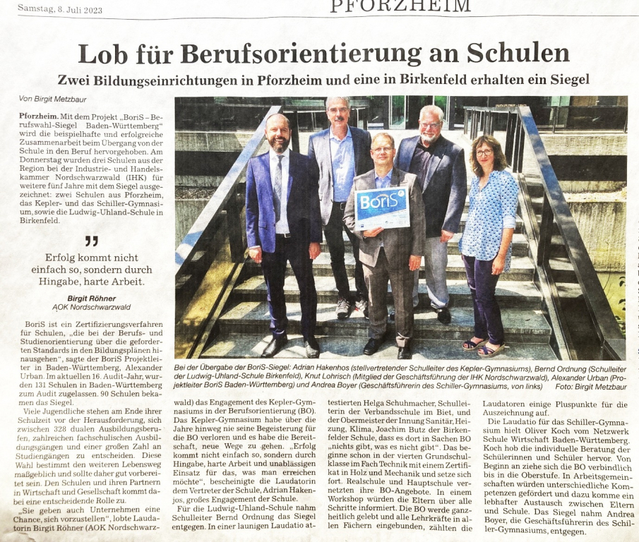Am Freitag, den 7. Juli war es mal wieder soweit: Zum dritten Mal konnte die Ludwig-Uhland-Schule in Birkenfeld das begehrte Berufswahlsiegel BoriS in den Händen halten. Das BoriS-Berufswahl-SIEGEL Baden-Württemberg ist ein Zertifizierungsverfahren für Schulen, die im Themenbereich Berufs- und Studienorientierung über die geforderten Standards in den Bildungsplänen und Verwaltungsvorschriften hinausgehen. Alle weiterführenden Schulen (können sich um eine Teilnahme am Zertifizierungsprozess bewerben.