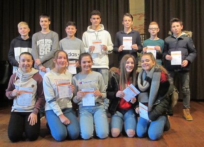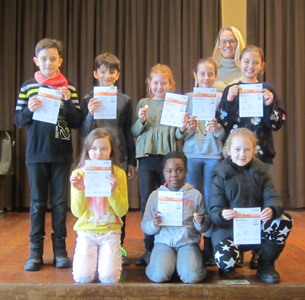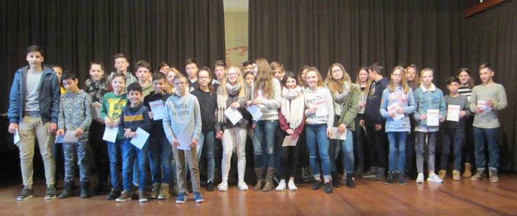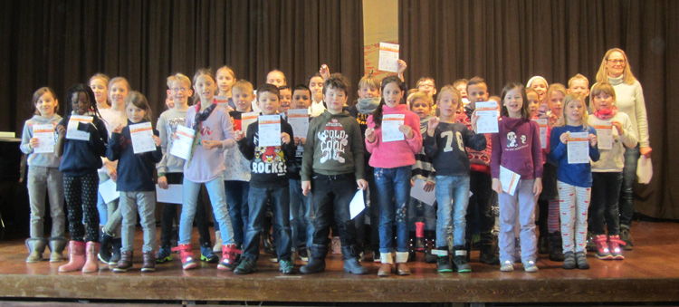 Im Rahmen der Sommerbundesjugendspiele absolvierten die Kinder der ersten bis siebten Klasse die Disziplinen Sprint (= Schnelligkeit), Ballwurf (= Kraft), Weitsprung (= Koordination) und 800- bzw. 1000m Lauf (= Ausdauer), die älteren Schülerinnen und Schüler konnten die Bundesjugendspiele auf freiwilliger Basis absolvieren. In den Bereichen, in denen die Bedingungen des DOSB nicht erfüllt wurden, durften die Kinder dann im Sportunterricht oder beim Koordinationstag der Grundschule andere Disziplinen ausprobieren. Die Koordinationsfähigkeit konnte z.B. mit Seilspringen oder dem Zonenweitsprung, das Ballwerfen durch den Standweitsprung ersetzt werden. Nachdem alle Leistungen ausgewertet und an den Sportkreis Pforzheim/Enzkreis verschickt worden waren, war es letzte Woche endlich soweit. Am Donnerstag, 10. Januar 2019 durften die Schülerinnen und Schüler im Rahmen einer kleinen Feier ihre Urkunden und die entsprechenden Abzeichen in Empfang nehmen.