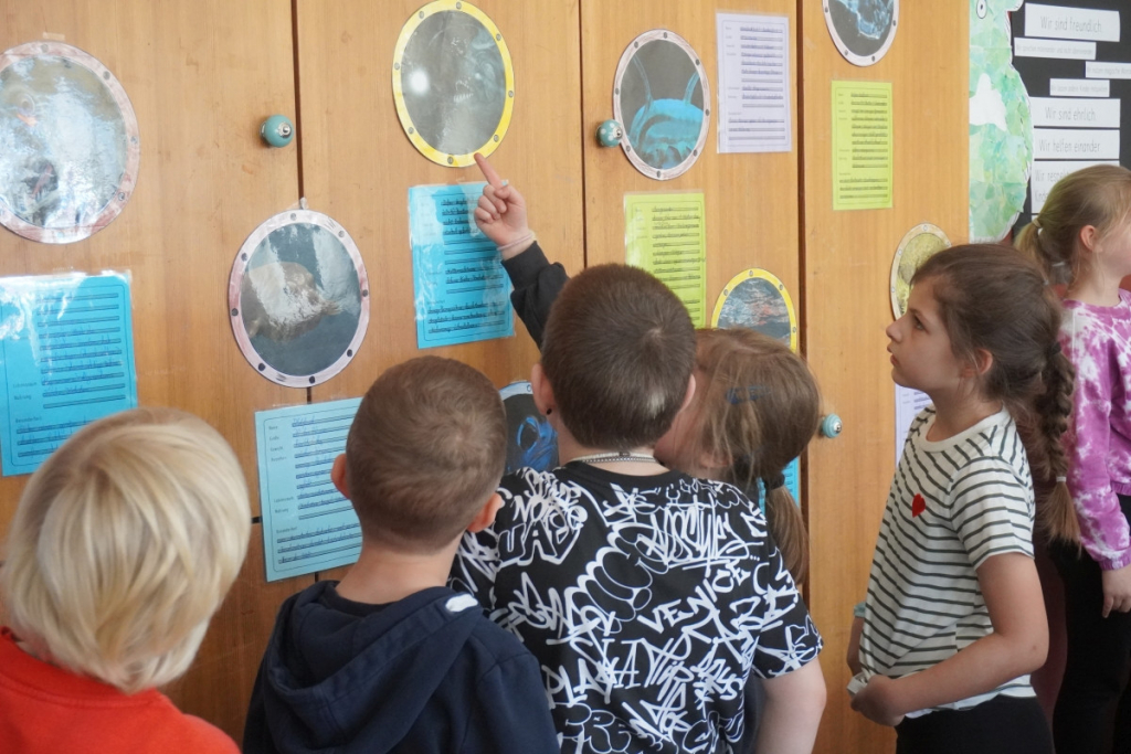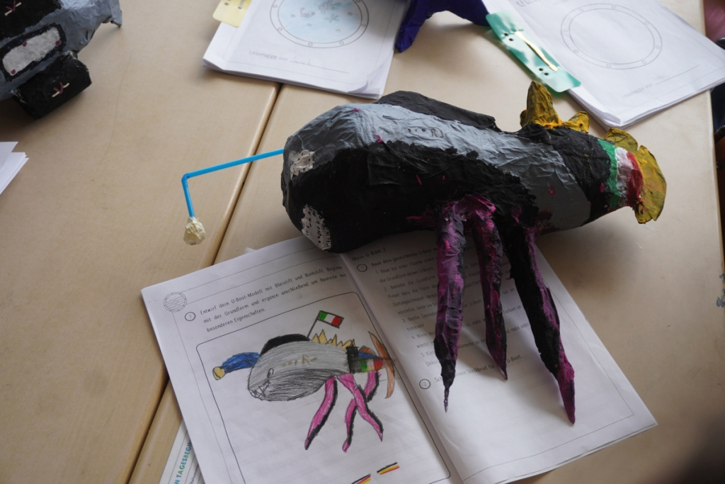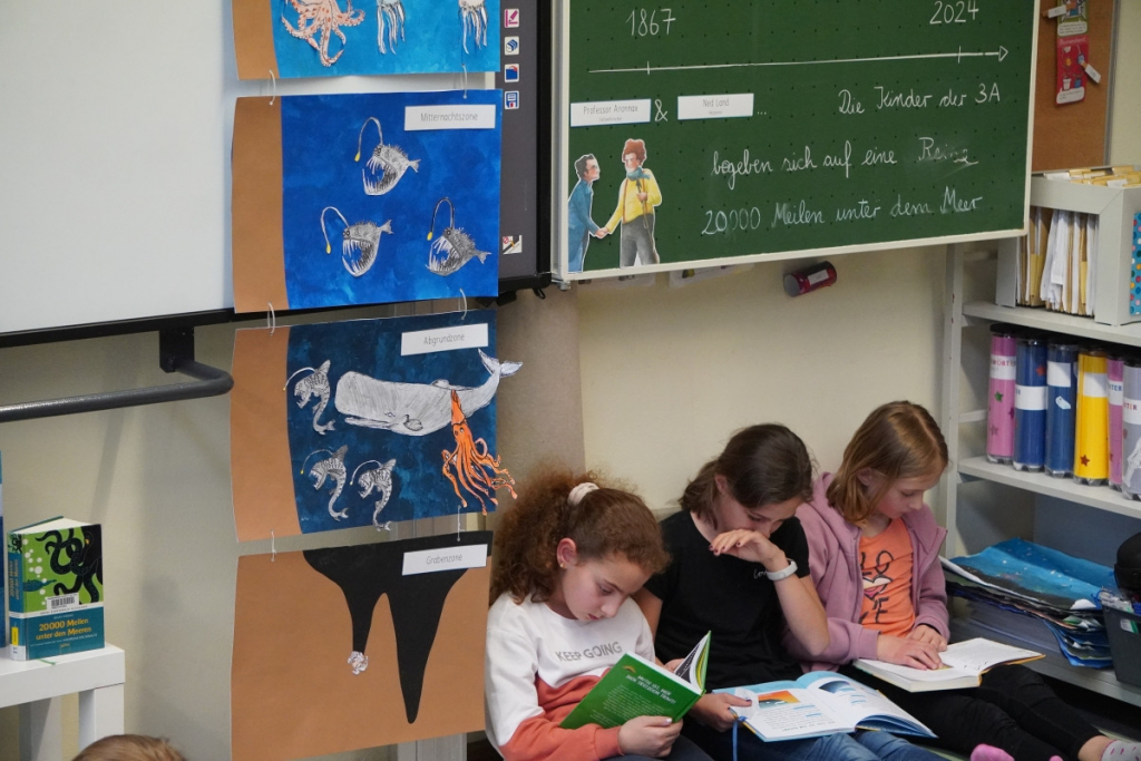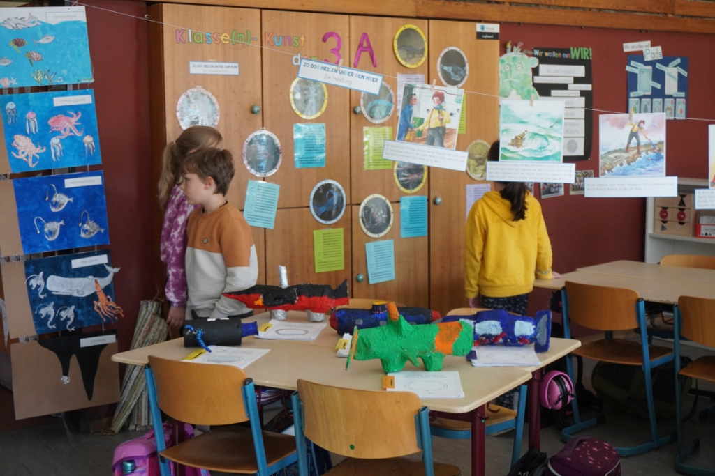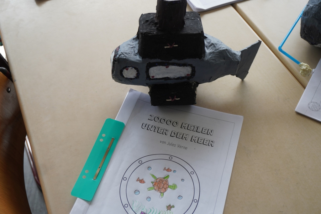 Die Kinder der Klasse 3a begaben sich auf ein Abenteuer in, über und unter den Meeren: Sie begleiteten Kapitän Nemo, Professor Aronnax und dessen Assistenten Ned Land auf ihrer abenteuerlichen Reise „20.000 Meilen unter dem Meer“. Der Literaturklassiker von Jules Vernes weckte ihre Leselust und war Anlass, um sich aus der Literatur hinaus kreativ mit Meereswissen und Meeresschutz auseinanderzusetzen.