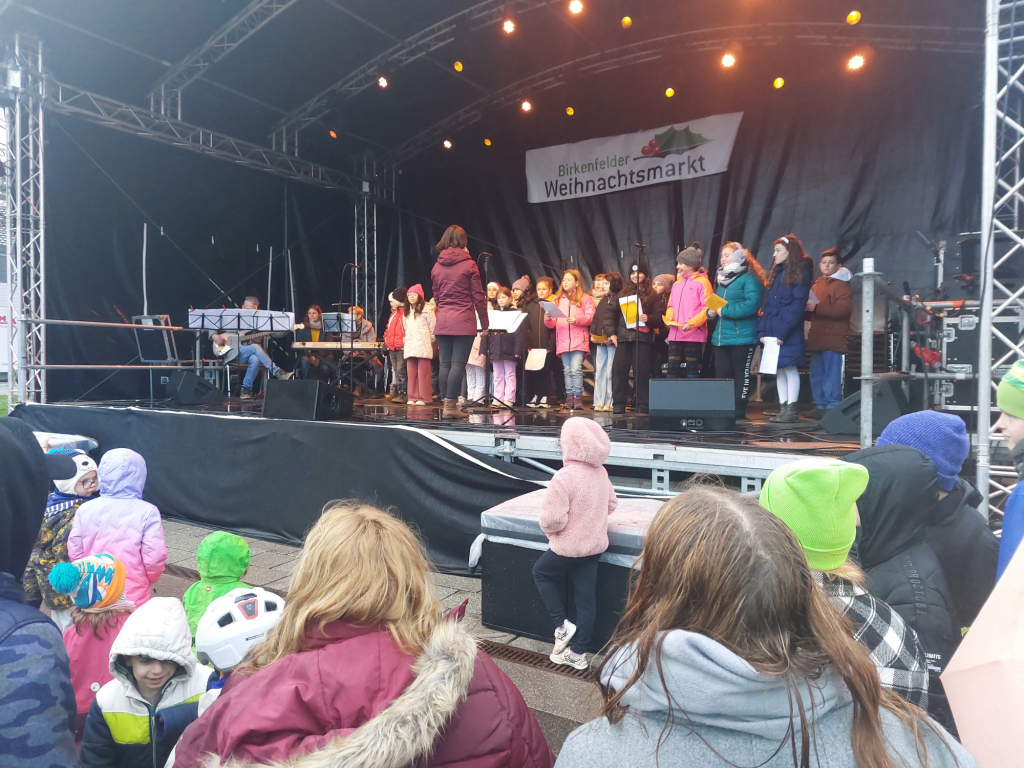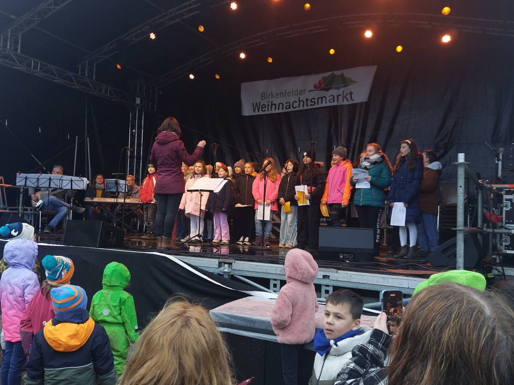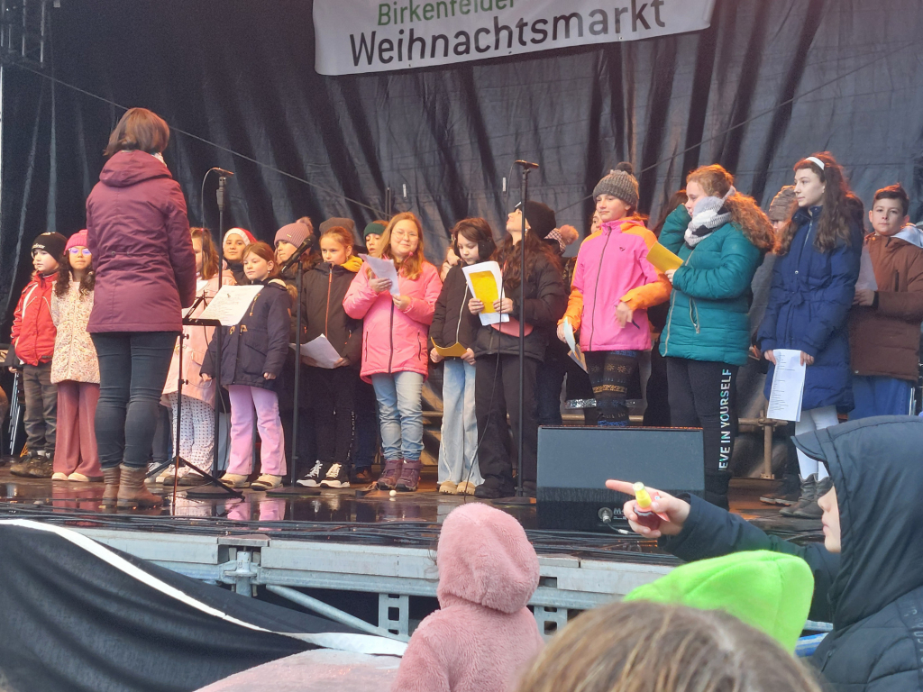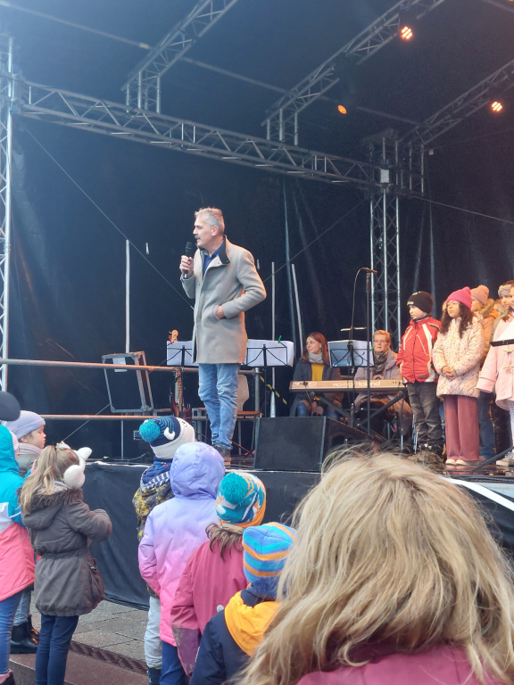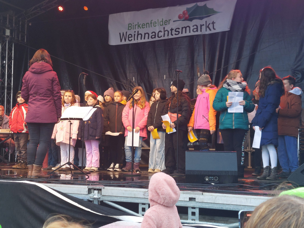 Die dritte gute Botschaft konnten wir der einstudierten weihnachtlichen Kantate am Birkenfelder Weihnachtsmarkt entnehmen. Es ging um Ebenezer Scrooge, den alten griesgrämigen Geizkragen aus der bekannten Weihnachtsgeschichte von Charles Dickens. Der mürrische alte Scrooge, der nicht einmal an Weihnachten seinen Angestellten frei geben möchte, erlebt in einer wundersamen Nacht seine Vergangenheit, seine Gegenwart und seine Zukunft als Vision. Natürlich ist das Ganze so eindrucksvoll, dass Scrooge als reuiger Sünder nach dieser Nacht ein besseres Leben anstrebt und Besserung gelobt… Vielen Dank auch an Frau Wasiak, die den Chor souverän am Klavier begleitet hat!