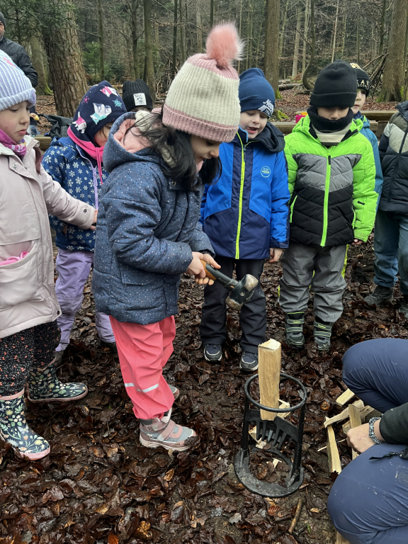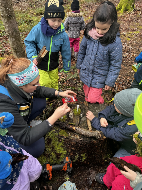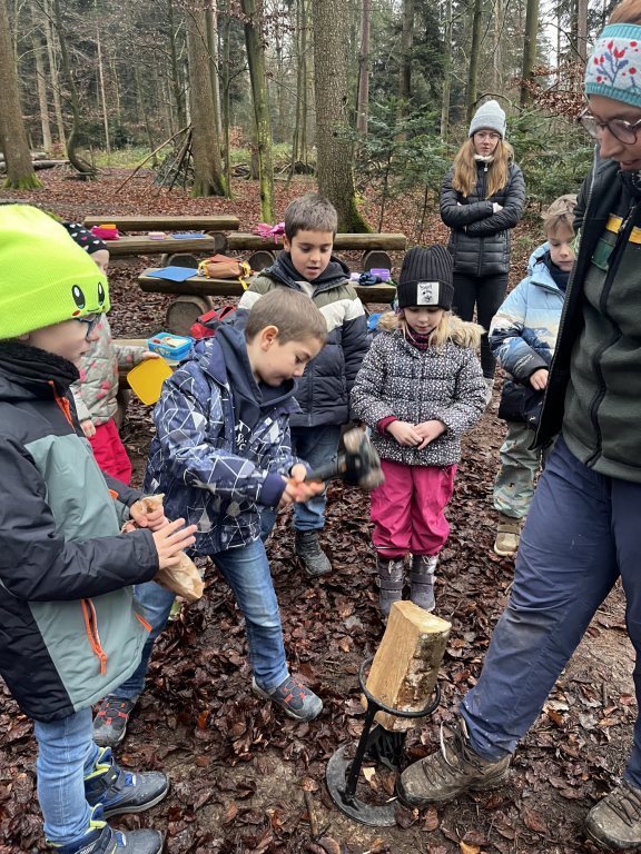 Ein weiteres Highlight des Tages war das Holz hacken, bei dem die Kinder ihre Geschicklichkeit unter Beweis stellen konnten. Zudem hatten sie die Möglichkeit, eine kleine Krippe im Wald zu bauen oder kreative Weihnachtsdekoration zu basteln.