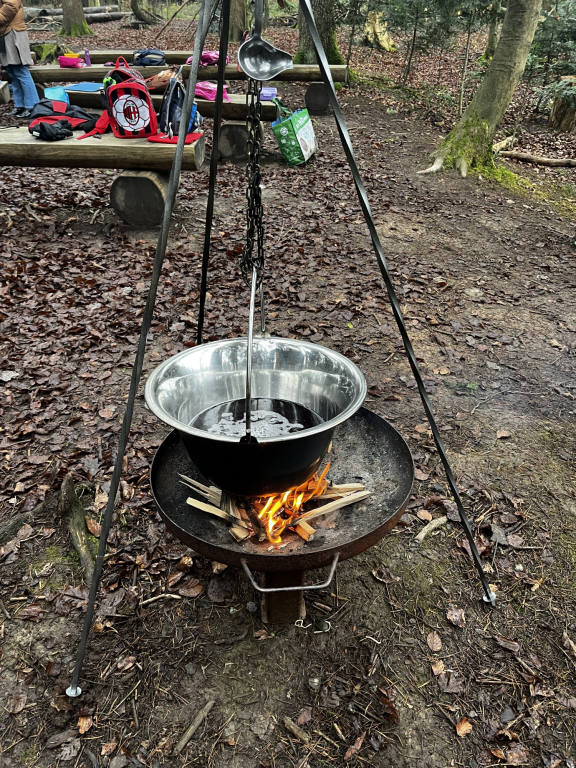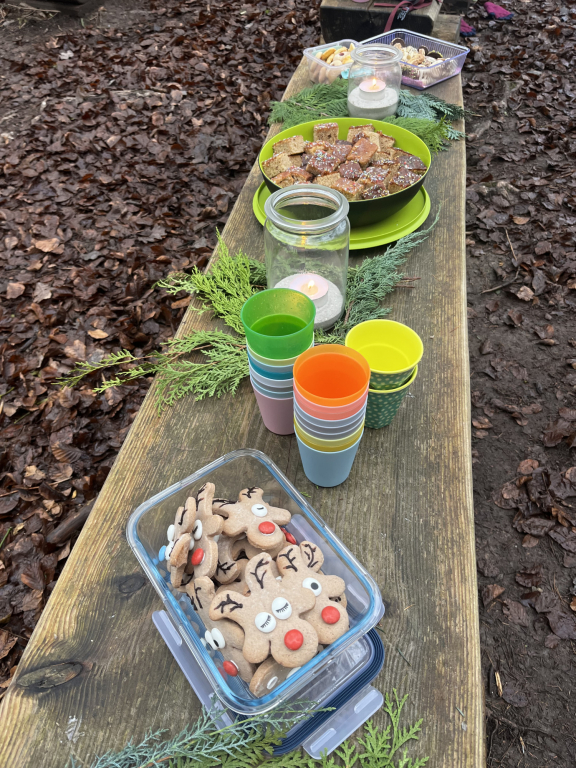 Nach dem spannenden Spaziergang wartete ein köstliches Buffet auf die jungen Entdecker. Die Eltern hatten Plätzchen und Kuchen vorbereitet, während über der Feuerschale der ein duftender Kinderpunsch erhitzt wurde.