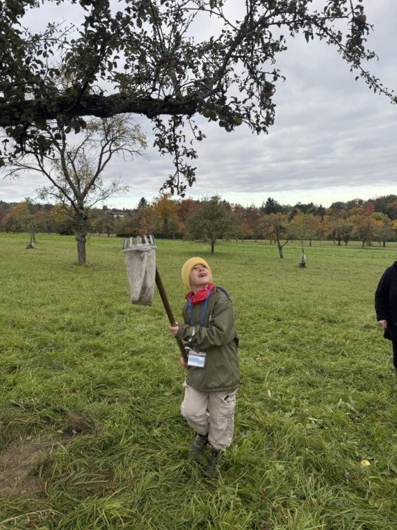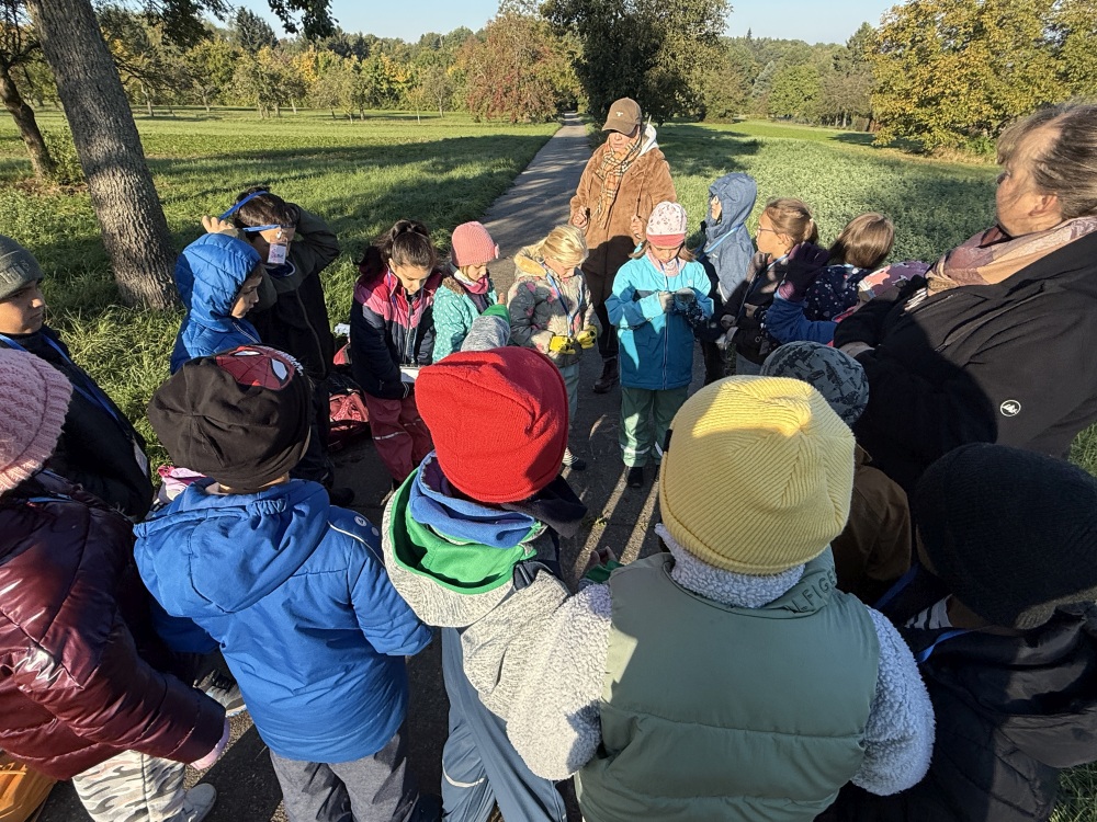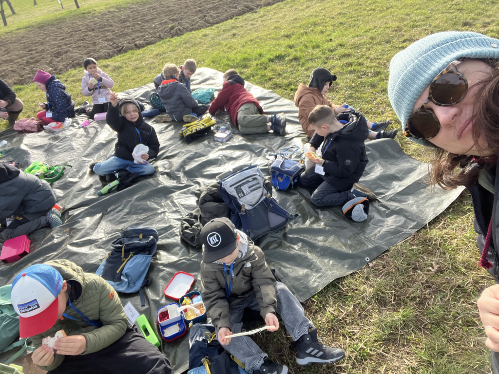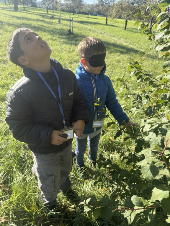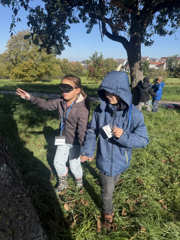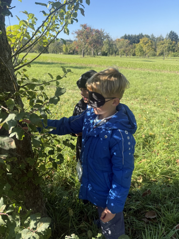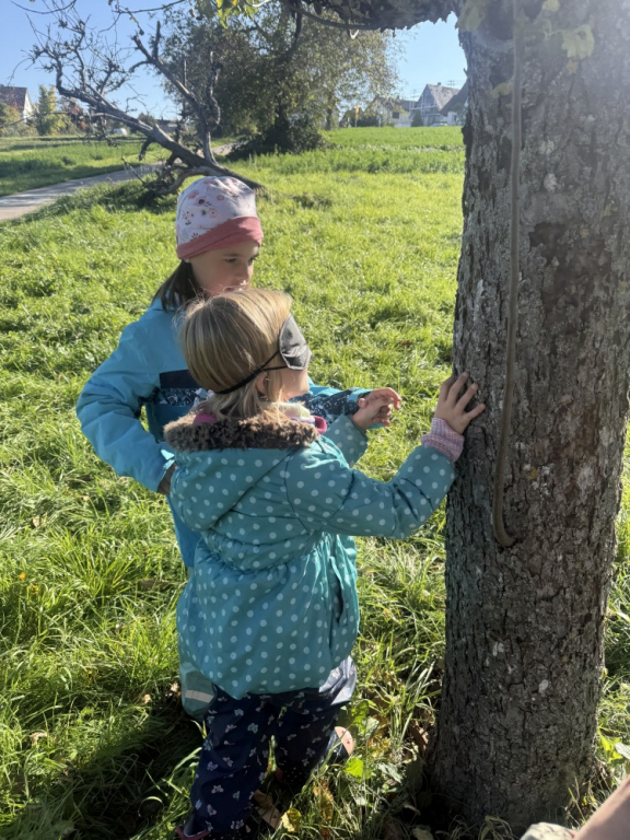 Ein besonderes Highlight war das „Fühlen mit verbundenen Augen“: In Partnerarbeit ertasteten die Kinder die Rinde der Bäume und entdeckten dabei, wie unterschiedlich sich Natur anfühlen kann. Natürlich durfte auch eine gemütliche Vesperpause unter freiem Himmel nicht fehlen – frische Luft macht schließlich hungrig! Ein riesiges Dankeschön geht an den Förderverein, der dieses tolle Projekt möglich macht, und an Frau Raus für die wunderbare Begleitung. Die Begeisterung der Kinder ist groß – und alle freuen sich schon sehr auf die nächsten Abenteuer auf der Streuobstwiese! 🌿✨