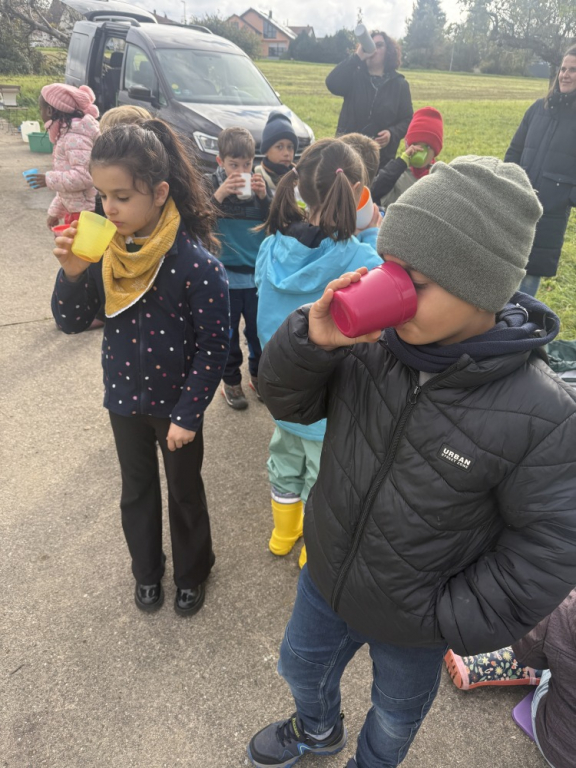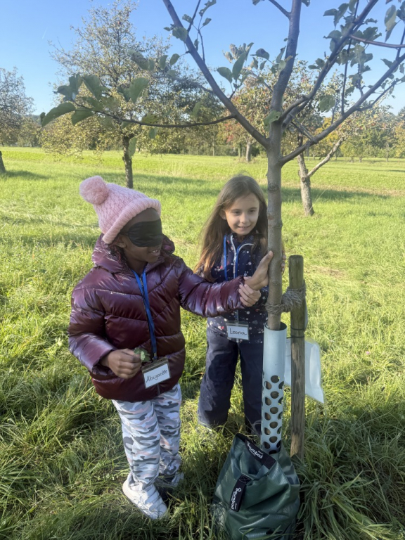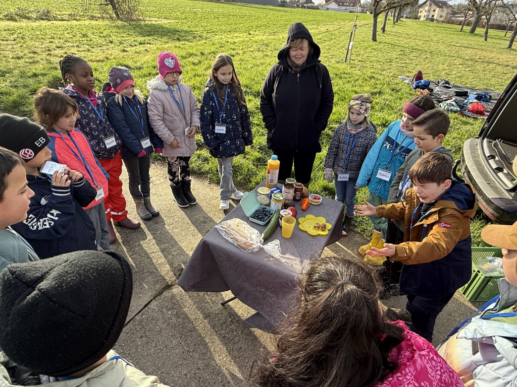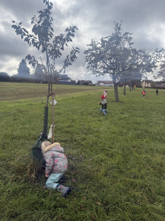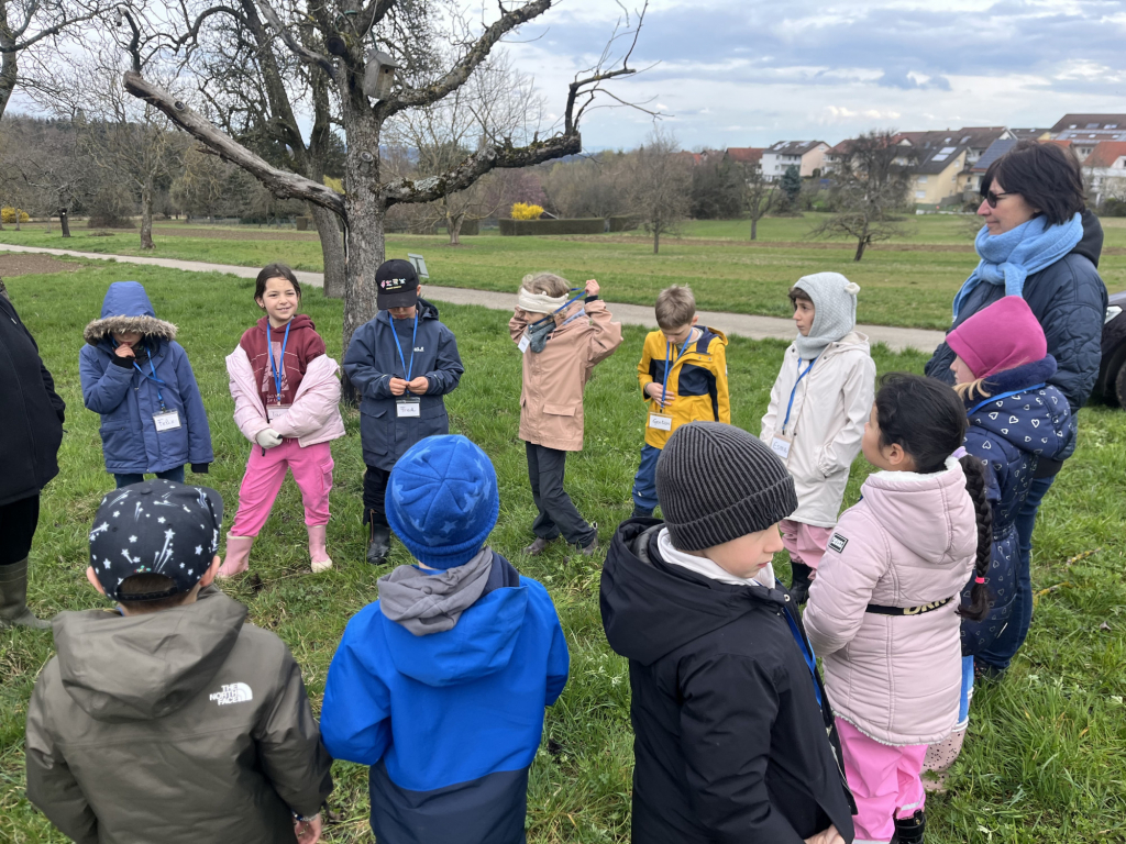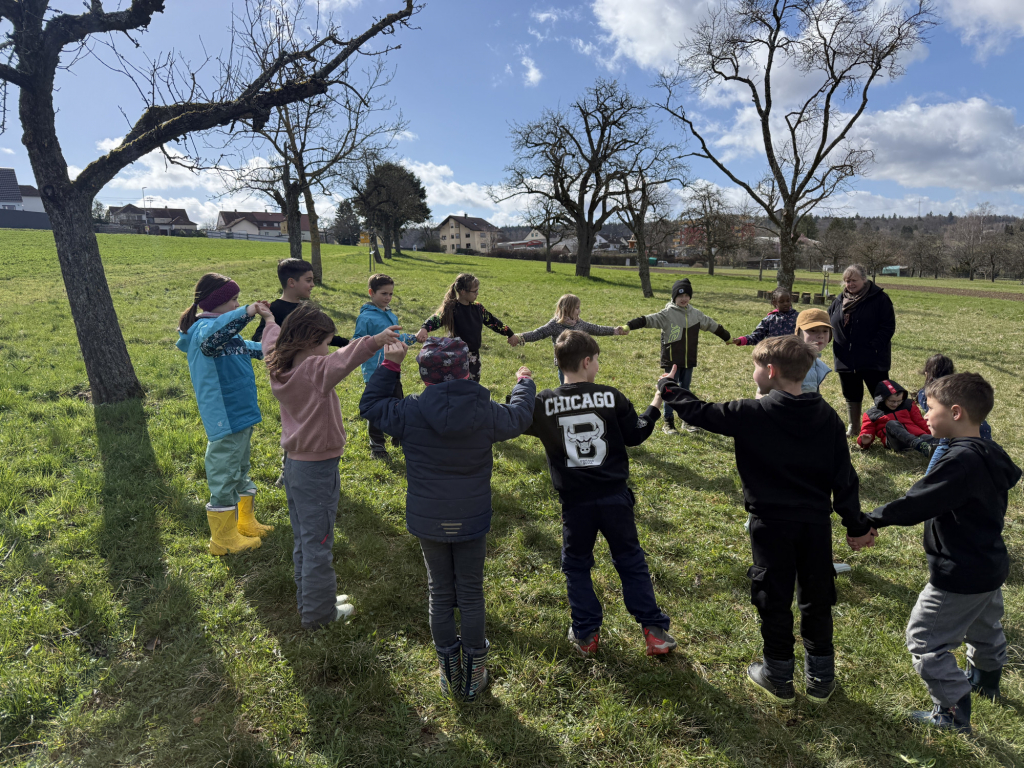 Ein besonderes Highlight war das „Fühlen mit verbundenen Augen“: In Partnerarbeit ertasteten die Kinder die Rinde der Bäume und entdeckten dabei, wie unterschiedlich sich Natur anfühlen kann. Natürlich durfte auch eine gemütliche Vesperpause unter freiem Himmel nicht fehlen – frische Luft macht schließlich hungrig! Ein riesiges Dankeschön geht an den Förderverein, der dieses tolle Projekt möglich macht, und an Frau Raus für die wunderbare Begleitung. Die Begeisterung der Kinder ist groß – und alle freuen sich schon sehr auf die nächsten Abenteuer auf der Streuobstwiese! 🌿✨