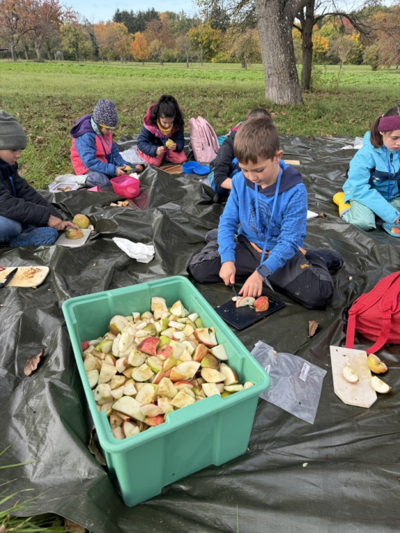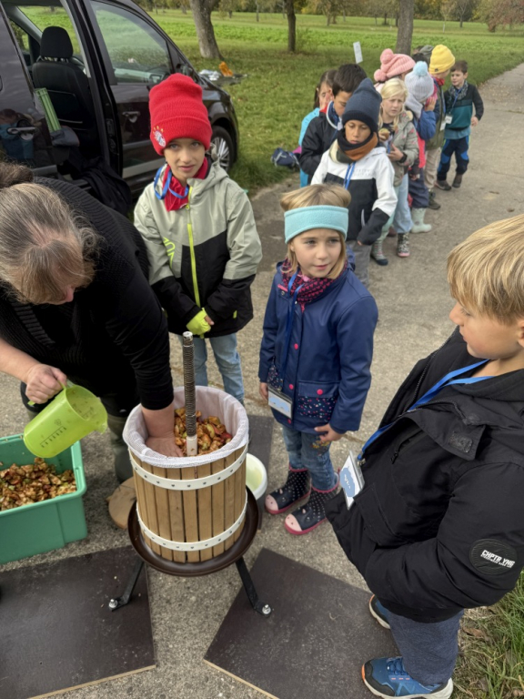 Apfelsaft selbst gemacht – die Zweitklässler auf der Streuobstwiese Vergangene Woche besuchten die Zweitklässler die Streuobstwiese. Dort drehte sich alles um das Thema Apfel. Zunächst erfuhren die Kinder, was Fruchtzucker eigentlich ist, und verglichen den Zuckergehalt von Apfelsaft und Cola – schnell war klar, welches Getränk gesünder ist! Anschließend ging es ans Werk: Mit viel Freude sammelten die Kinder Äpfel, pflückten sie direkt vom Baum und bereiteten sie weiter vor. Die Früchte wurden klein geschnitten, geschreddert und schließlich mit viel Muskelkraft gepresst. Zum Abschluss durfte natürlich auch probiert werden. Der selbst hergestellte Apfelsaft schmeckte herrlich süß, fruchtig und frisch! Die Kinder waren mit großer Freude dabei, hatten sichtlich Spaß und werden diesen besonderen Tag auf der Streuobstwiese sicher noch lange in guter Erinnerung behalten.