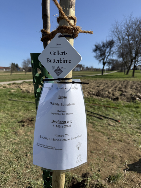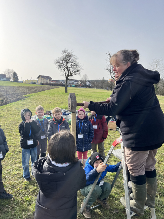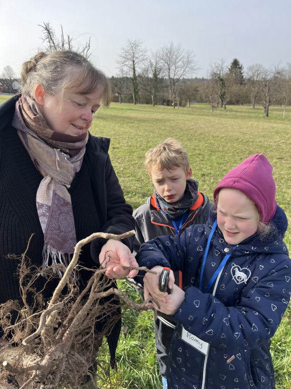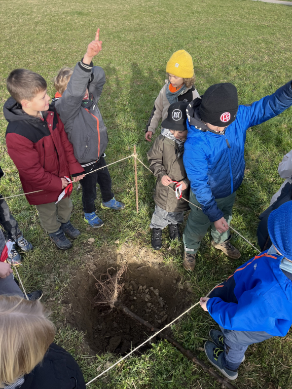 Diese Woche Anfang März war es endlich wieder so weit: Die Zweitklässler durften auf die Streuobstwiese! Und diesmal stand etwas ganz Besonderes auf dem Plan: „Wir pflanzen einen Baum!“ Die Klasse 2a hat einen Apfelbaum gepflanzt und die Klasse 2b einen Birnenbaum. Bevor wir loslegten, haben wir erst einmal über den Aufbau eines Baumes gesprochen und dabei viel gelernt. Dann ging es an die Arbeit: Zuerst wurde ein Pfahl in das Loch gehämmert, damit der junge Baum später eine gute Stütze hat. Danach schnitten wir vorsichtig die Wurzeln an und setzten den Baum in das Loch. Mit vereinten Kräften wurde alles wieder mit Erde aufgefüllt – da hieß es: „Alle anpacken!“ Zum Schluss befestigten wir den Baum am Pfahl und gossen ihn gut mit Wasser. Jetzt hoffen wir natürlich, dass unsere beiden Bäume kräftig wachsen und uns irgendwann leckere Früchte schenken. Wer unsere Apfel- und Birnenbäume sehen möchte, kann sie gerne auf der Streuobstwiese besuchen. Vielleicht entdeckt ihr ja schon bald die ersten Knospen!