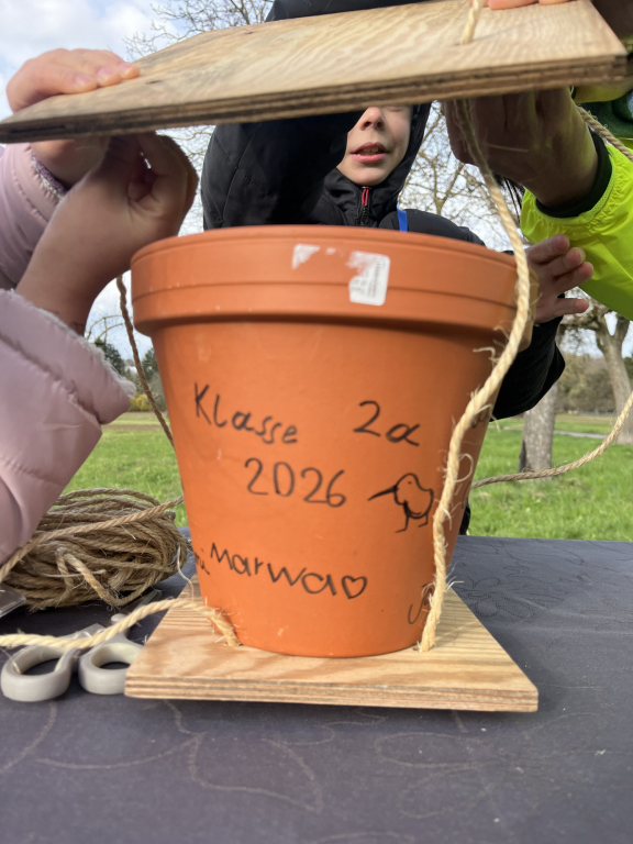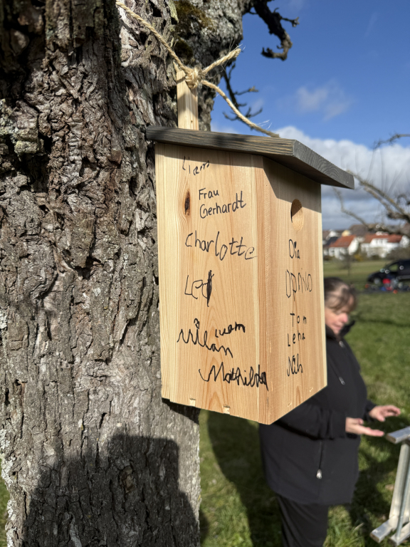 Das zweite Highlight gab es für die 2a. Die Kinder haben Nistkästen gebaut und diese an gut geeigneten Stellen auf der Streuobstwiese platziert.