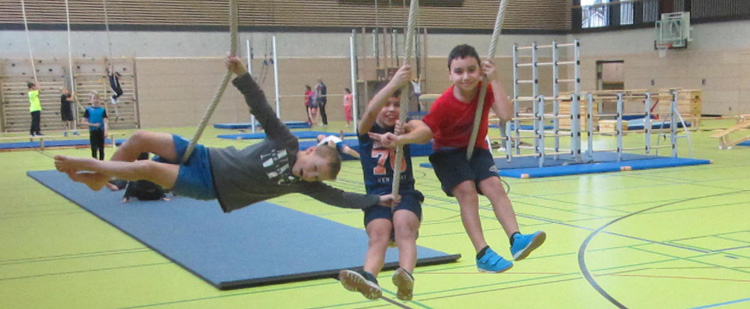 Besonders viel Freude bereiteten den Schülerinnen und Schülern das Schwingen an den Seilen, die vielen Turnmöglichkeiten an Ringen und Reck, oder das Balancieren auf dem Schwebebalken. Ein weiteres Highlight stellten die zahlreichen Klettergelegenheiten an den Sprossenwänden, Boulderwänden und Klettertürmen dar, an denen die Schülerinnen und Schüler jeder Klassenstufe jeweils eine ganze Schulstunde ihre Grenzen austesten durften. Dank der vielen abwechslungsreichen Großgeräte und dem vielen Platz in der Hermann-Gross-Sporthalle kam es zu keinen längeren Wartezeiten, sodass jedes Kind, ob sportbegeistert oder nicht, auf seine Kosten kam. Selbst die Vorschulkinder aus dem Kindergarten Jahnstaße, die auch dieses Jahr wieder eingeladen waren, probierten alle Geräte aus und ha tten dabei viel Spaß.