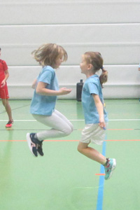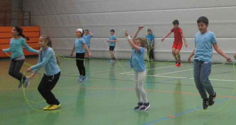 Intensiv Sport treiben und gesund bleiben. Sport und ein gesundes kräftiges Herz. Für die Kinder der Klasse 4b ist es einleuchtend. Danach sind die 19 Kinder der Klasse 4b motiviert genug, um in einem Workshop zahlreiche Sprungvarianten mit dem dünnen Rope Skipping Seil auszuprobieren und zu üben. Und das machte riesig Spaß und puh, es war aber auch ganz schön anstrengend. Denn nur durch die notwendigen Trinkpausen unterbrochen, springen die Viertklässler 90 Minuten lang und erlernen sehr schnell verschiedene Sprünge allein, zu zweit oder in der Gruppe. Bei der anschließenden Aufführung des Gelernten vor den Mitschülern der Klassen 2, 3 und 4 und einigen Eltern und Großeltern war das Staunen groß, was Filip Panic mit den Kindern in der kurzen Zeit auf die Beine gestellt hat und was man mit einem modernen Hüpfseil alles machen kann.